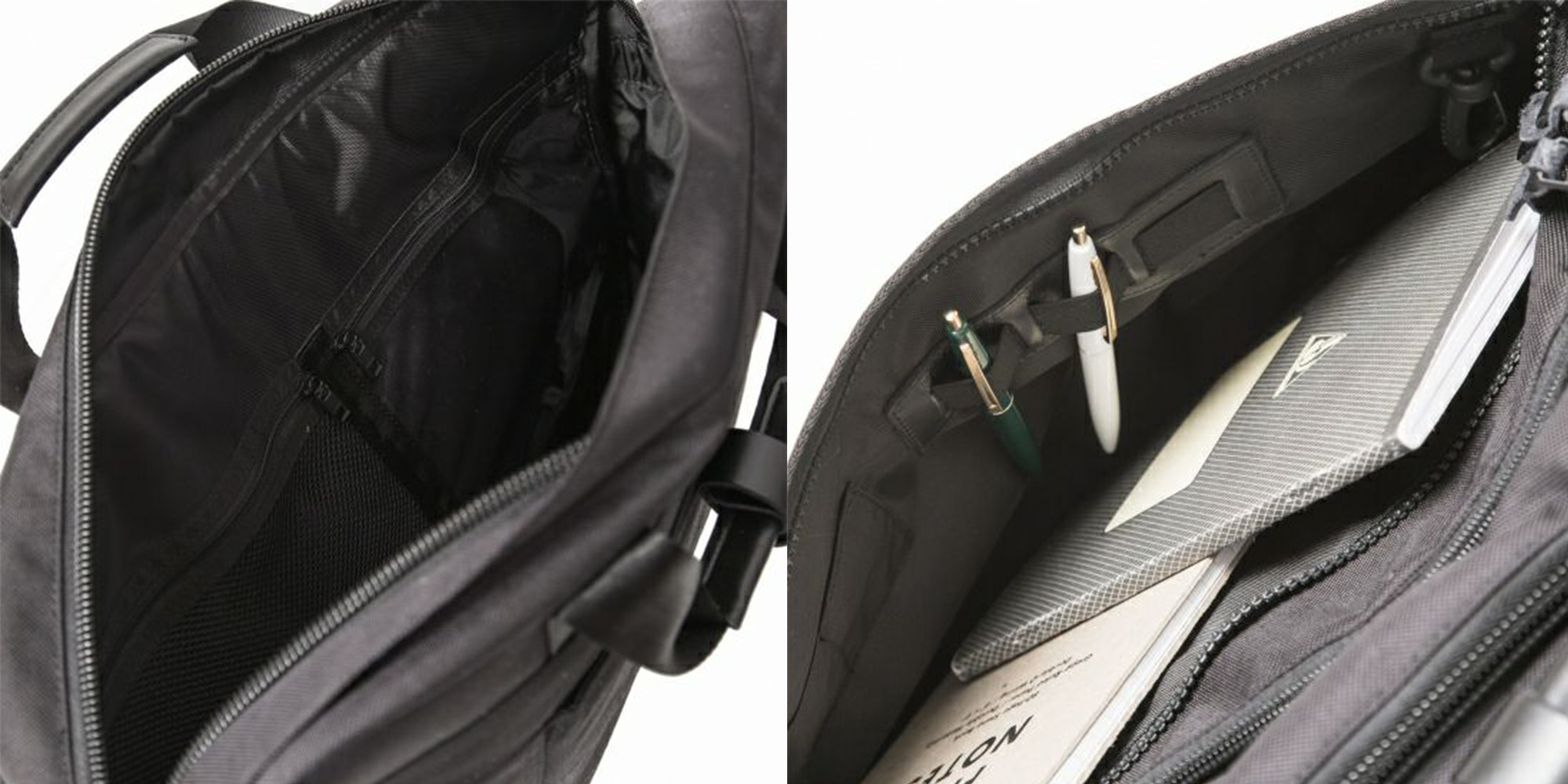 内部に、ペン、文庫本サイズ、USBなどの小分けできるポケットなど9つ収納箇所を配置しています。1泊の出張が余裕を持って対応できる容量です。