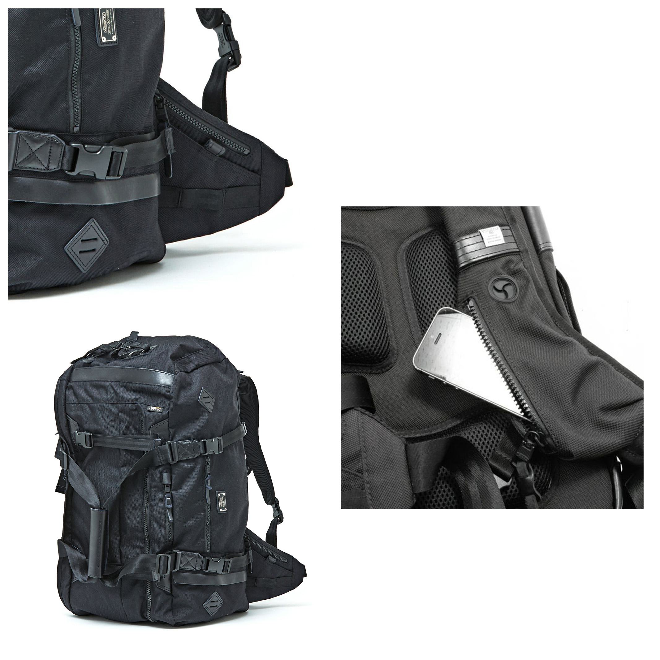 すぐに取り出したい物をいれておく腰ポケットがあります。鍵や交通系電子カードなどをいれておくのに最適です。左ショルダーハーネスには、スマートフォンやイヤホンなどの小物を収納出来るジップポケットを配置しています。使わないときは、内側に折り込むことで、スマートに見せることも出来ます。