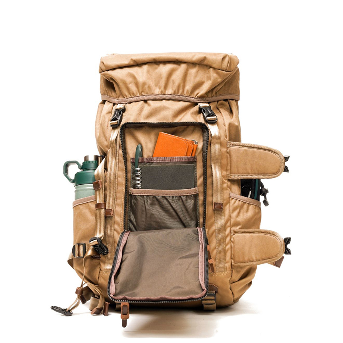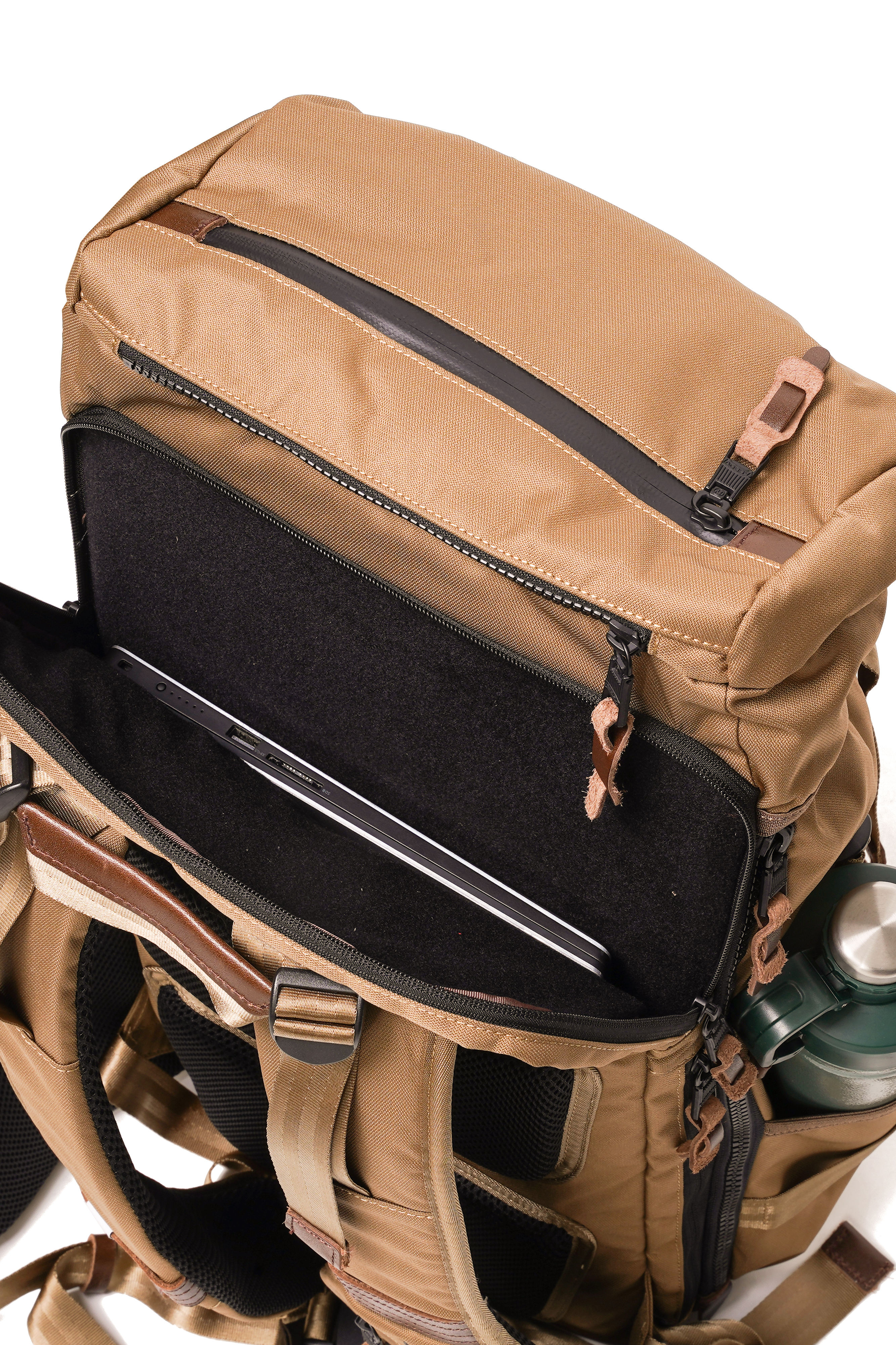 スーツケースのようにコの字型に大きく開くメインポケットは中のものを整理しやすくなっており、背面には独立したPC収納スペースを設けています。ハーネスポケットや腰のポケット、前面のポケットをフル活用すれば出張中もメインのパッキングを崩さずに活動できます。