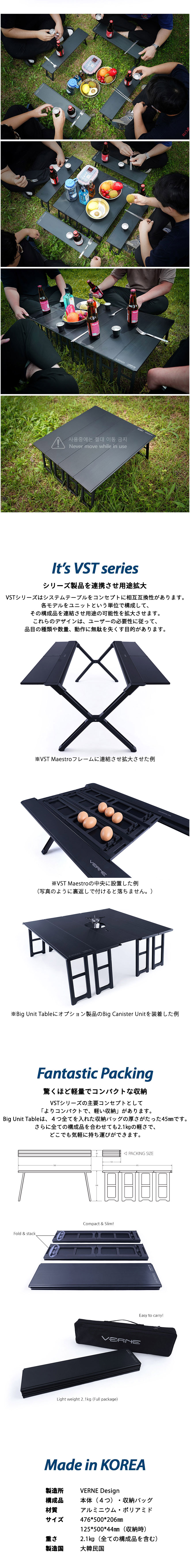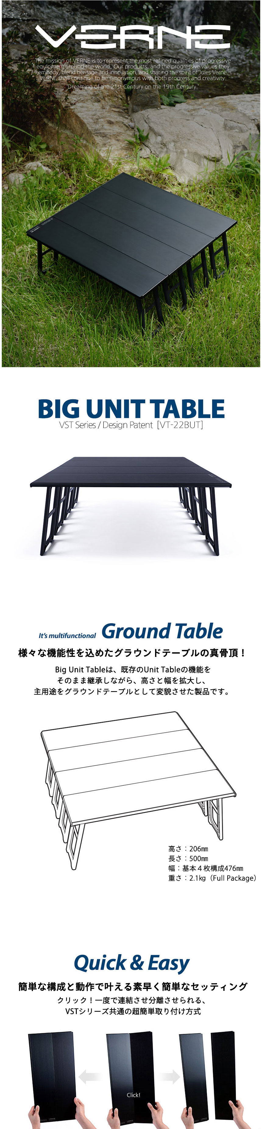 様々な機能性を込めたグラウンドテーブルの真骨頂! Big Unit Tableは、既存のUnit Tableの機能をそのまま継承しながら、高さと幅を拡大し、主用途をグラウンドテーブルとして変貌させた製品です。 VST(Verne System Table)シリーズはシステムテーブルをコンセプトに相互互換性があります。各モデルをユニットという単位で構成して、その構成品を連結させ用途の可能性を拡大させます。 これらのデザインは、ユーザーの必要性に従って、品目の種類や数量、動作に無駄を失くす目的があります。VSTシリーズの主要コンセプトとして「よりコンパクトで、軽い収納」があります。 Big Unit Tableは、4つ全てを入れた収納バッグの厚さがたった45?です。 さらに全ての構成品を合わせても2.1?の軽さで、どこでも気軽に持ち運びができます。 VERNE VSTシリーズはこちら VERNE ディレクターインタビューはこちら