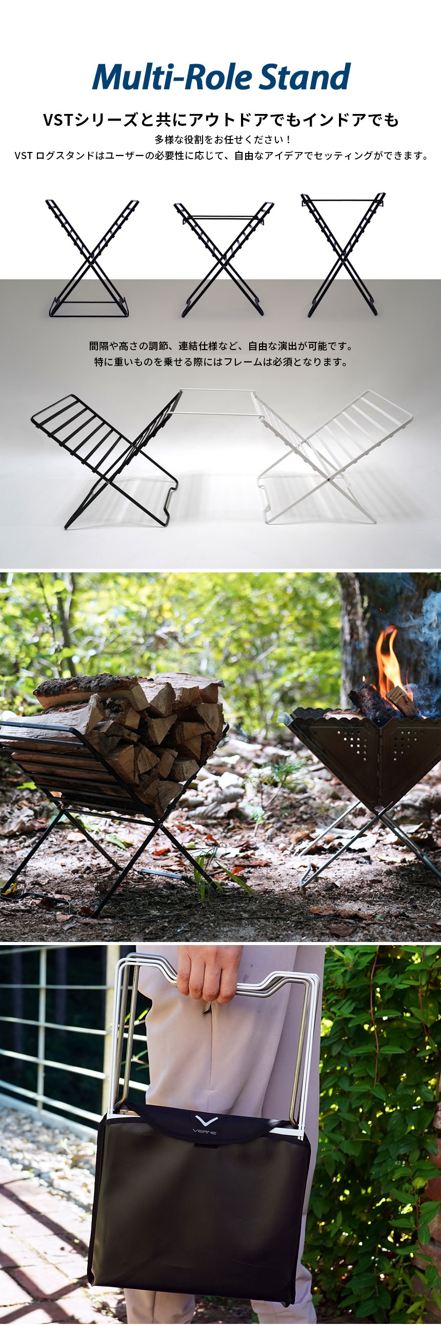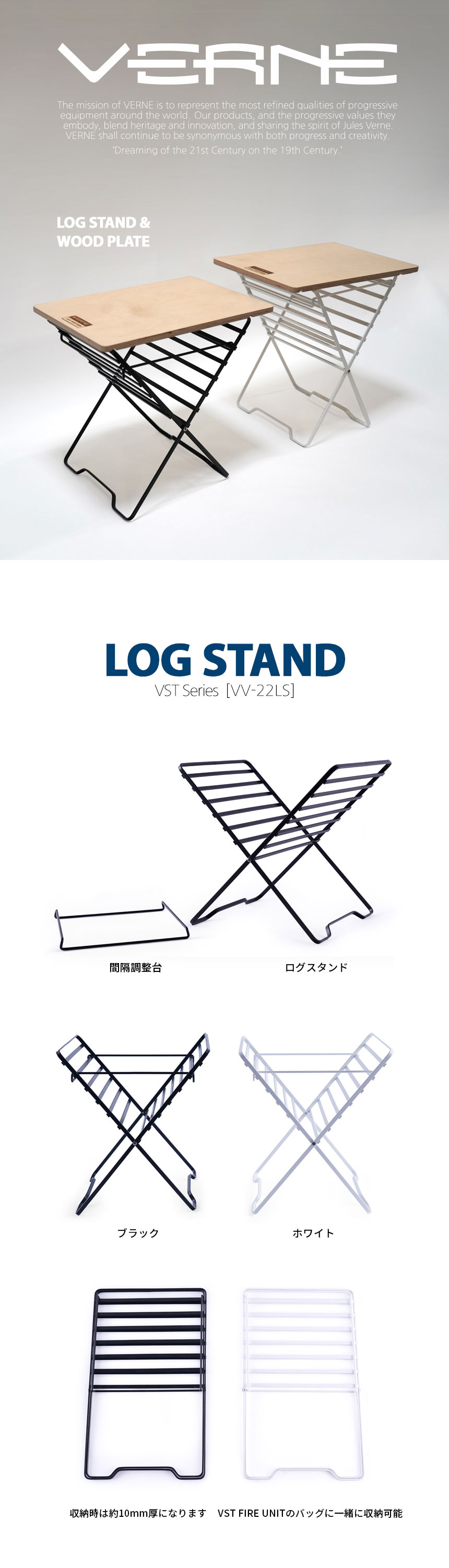 VSTウッドプレートと組み合わせが可能なログスタンド。 間隔や高さの調節、連結仕様など、自由な演出が可能で、コンパクトに収納できます。 ※ウッドプレートは別売です。 VERNE VSTシリーズはこちら VERNE ディレクターインタビューはこちら