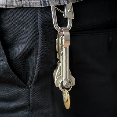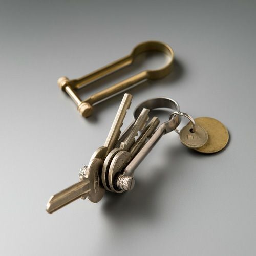 MATERIAL: Brass, CNR rubber washer, Brass washer TYPE: Brass SIZE: W3.4×D0.8×H7.7cm BRAND: CANDY DESIGN&WORKS / from JAPAN 真鍮製のシャックルタイプのキーリングになります。 キーリング本体に鍵を収納できますので、かさばる事なく鍵を持ち運ぶ事ができます。 2〜6本の鍵を収納可能です。