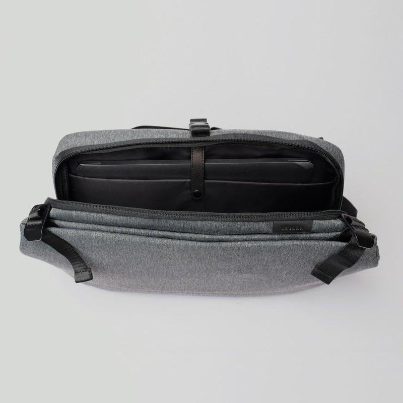 デバイスを中央の収納部に下重心でなく、分散されるように収納が出来る為ボディバックのフィット感・メッセンジャーバッグの容量どちらも叶えられます。