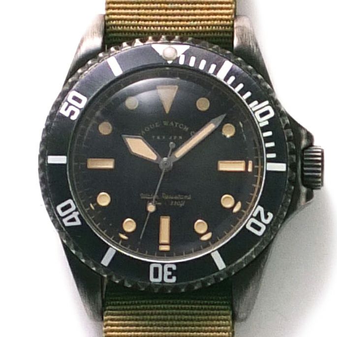 "アンティークウォッチの雰囲気を手軽に楽しめる腕時計"をコンセプトに制作された VAGUE WATCH Co の旗艦モデル「BLK SUB」は 1970年台に某国海軍の上官に支給されたダイバーズウォッチがモチーフです。 所々メッキの落ちた時計本体は、IPメッキをかけたあとに一つずつ職人の手により表面を粗く削る加工を施し長年使い古したような風合いを表現しております。 【ケース】 ステンレススチール、IP BLKメッキ [ size 40mm ] 【ムーブメント】 日本製クォーツムーブメント 【風防】 ドーム型硬化クリスタルガラス 【ベルト】 ナイロンベルト ブラック、オリーブ 2本 [ size 20mm ] 【付属】 軍用サングラスケースモチーフのオリジナルポーチ 【防水】 100m 防水