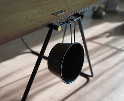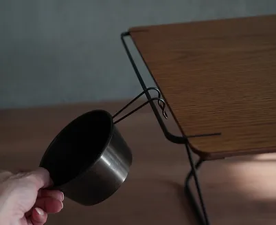 テーブルのサイド面には、オプションの拡張を可能とするハンガーを設置。また、シェラカップなどの小物類を吊り下げる使い方も。