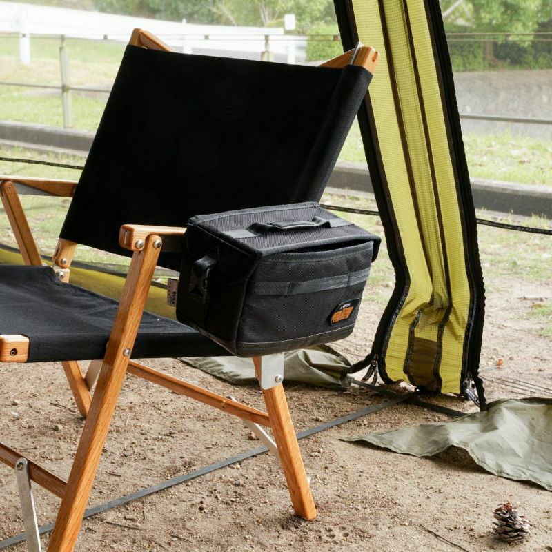 クランプパーツの逆には大き目のフックがあり、本モデルの収納袋やオプションとして発売されている【DRINK HOLDER】や【MINI CONTAINER】を掛けて使う事ができます。尚左の画像の用に収納袋自体にもトーチをはじめ、細かなものを収納する事ができます。