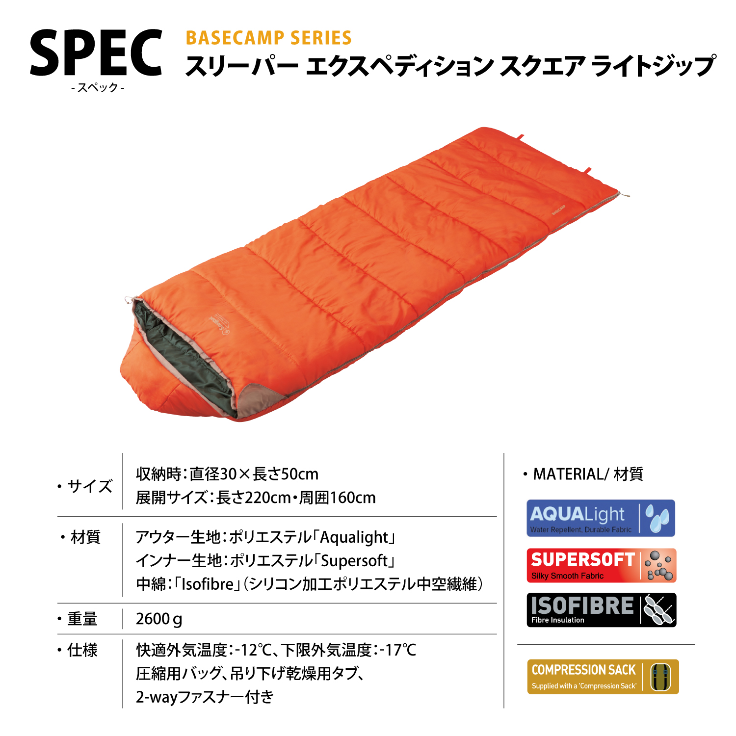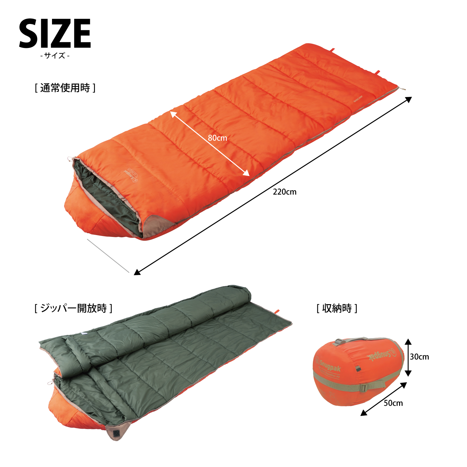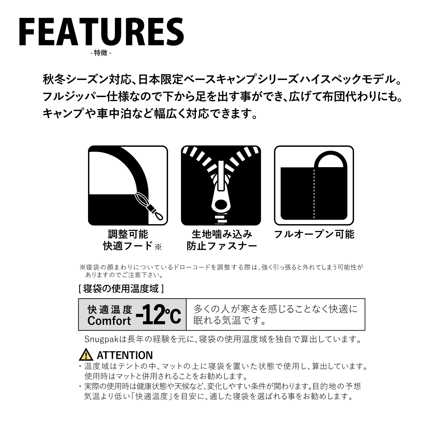 キャンプや車中泊に最適な、エントリーユーザー向けのベーシックモデル ・秋冬2シーズン型のスリーピングバッグ。 ・当社がSnugpak社にカラーと中綿量の増量を依頼して作成した、日本だけのスペシャルモデルです。 ・スリーパーエクストリームよりもさらに中綿量を増やし、特に真冬のシーズンに快適に過ごしていただけるように設定してます。 ・シリコーン製中空繊維の「Isofibre」保温材が中綿として充填されています。 ・裏地は柔軟でシルキータッチの滑らかな表面を持つソフトなスムースナイロン繊維「Supersoft」を使用していますので、とても快適にご使用頂けます。 ・足部分(底面)がフルジッパーになっておりますので、下から足を出す事ができ、ちょっとした簡単なキャンプでの車中泊などでも、とても便利で使いやすい寝袋です。また、フルオープンにできますので広げて布団代わりに使用できますし、干す時も快適に干せます。
