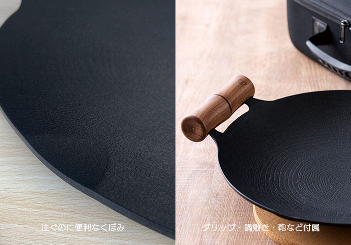 鉄板マルチグリドルは、手軽に持ち運びできる驚きの軽さで、サビや傷に強く、耐摩耗性に優れたイノーブルコーティングが施されています。 お家やキャンプで、焼いたり、炒めたり、煮込んだり、様々な料理が楽しめる万能鉄板。 高い熱伝導率をもつ鉄板マルチグリドルだから小さな火力でも素材の旨味を引出します。 本体裏の溝は12個に増え、様々な五徳に対応します。 29cm(単品)には、本体のほかに、シリコンミトンと収納袋が付属しています。 収納袋があるので持ち出す際も傷がつきにくくて便利です。 鉄板マルチグリドル29cm 専用ふたはこちら 焦付きにくいからお手入れが簡単。 鉄板マルチグリドルの表面は炭模様。 イノーブルコーティングという加工を施しているため焦げ付きにくく、調理後はサッと拭き取るだけでキレイに取れます。 さらに、錆びることもなく、シーズニングも必要ないのでお手入れがとても簡単です。 また耐久性に優れており、PFOA(人体に有害とされる環境汚染物質)の分析調査では検出なしの結果を取得していますので、安心してお使いいただけます。 登山やキャンプに手軽に持ち運びできる軽さ。 鉄板マルチグリドルはアルミ合金製のため、とても軽く、女性の方でも屋外へ手軽に持ち運びできます。 ツーリングやカヤック、登山やトレッキング、ソロキャンプなど、野遊びに大活躍まちがいなしです。 【ガスコンロ、バーナー等でのご使用の際の注意事項】 ガスコンロやバーナー等によっては使用可能な鍋のサイズなど記載がございますので、ご使用の際は、事故防止のため、必ずガスコンロやバーナー等の取扱説明書にある使用上の注意をよく読んでご使用下さい。 キャンプやお家で様々なメニューが楽しめる。 材質はアルミ合金でありながら、まるで鉄板のような熱伝導率を誇る鉄板マルチグリドル。 熱伝導率を考慮した4mmという厚さが、食材の旨味を引き出します。 ディープタイプはもちろん、フラットタイプにも、本体中心部にくぼみがあるため、焼く・炒める以外にも、水分の多い煮物や鍋も楽しめます。(左写真はフラットタイプです。) また、ガスコンロや焚火台での調理はもちろんですが、ラジエントヒーター、セラミックヒーターやハロゲンヒーターなど各種IHにも対応しているためご自宅での調理も可能です。 キャンプに行けなくてもご自宅で気軽にキャンプの雰囲気を味わって頂けます。 【対応熱源】 ガス、IH調理機、直火、炭火、ラジエントヒーター、セラミックヒーター、ハロゲンヒーター 鉄板マルチグリドルの裏にはJHQのロゴが刻印。 JHQの鉄板マルチグリドルの底には、JHQのゾウさんマーク、または、JHQのアウトドア商品ロゴが刻印されています。 また、底は高台でフラットなのであらゆるコンロにマッチします。 *2022年4月以降の商品より、JHQアウトドア商品ロゴが刻印されています。どちらもJHQの正規商品ですので安心してご利用ください。 使う人のことを考えた親切設計。 油切りや水分の調節がしやすいように縁の一部に凹みがあり、汁物をお皿に注ぎ分けるのに便利です。 また、鉄板マルチグリドルシリーズには、取り外し可能なシリコンミトンや木製のグリップ、鍋敷きや、鉄板マルチグリドル専用鞄が付属しており(*タイプやサイズによって付属品が異なります)、お家でも外でもすぐに使えて、熱々の料理を食卓へそのまま運べます。