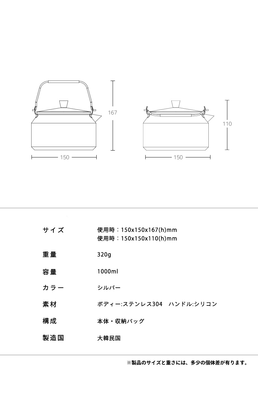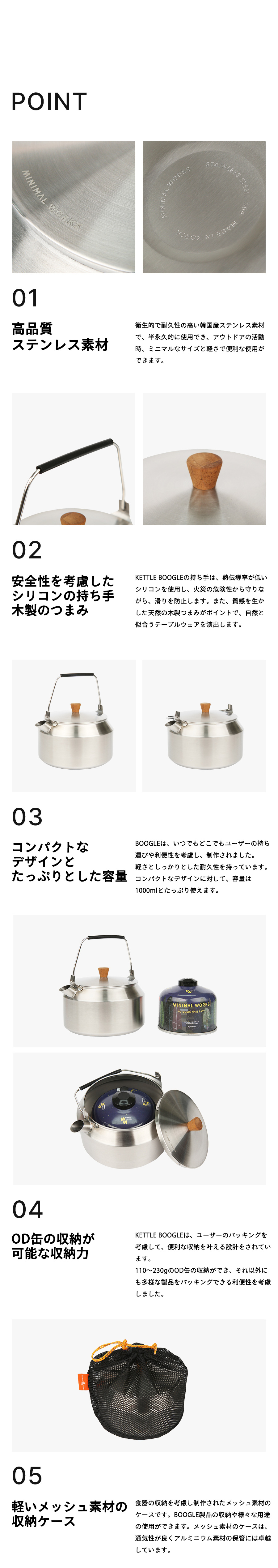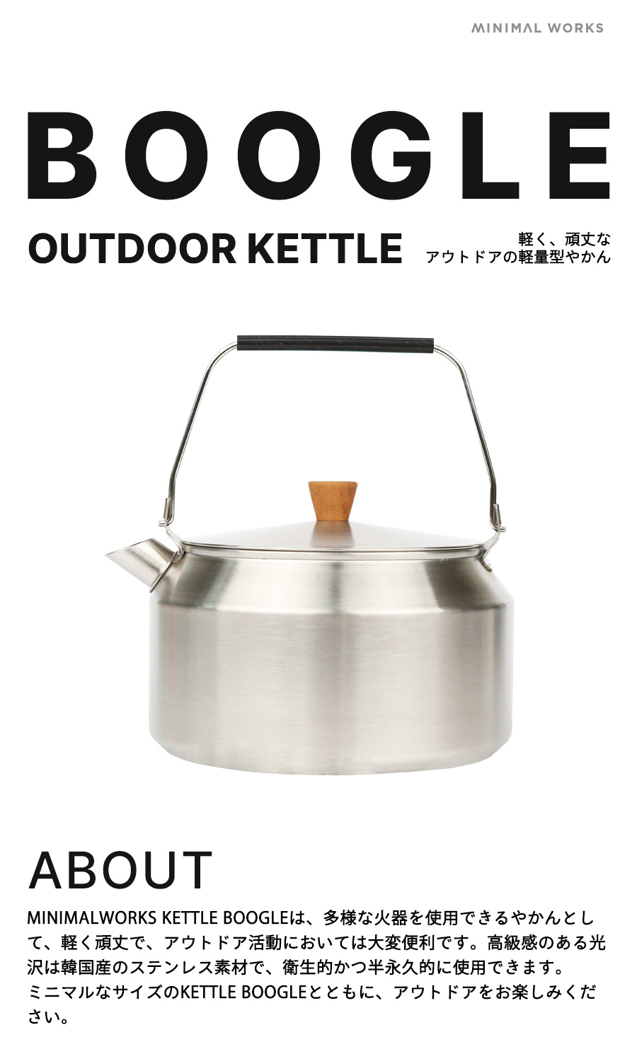 MINIMALWORKS KETTLE BOOGLEは、多様な火器を使用できるやかんとして、軽く頑丈で、アウトドア活動においては大変便利です。高級感のある光沢は韓国産のステンレス素材で、衛生的かつ半永久的に使用できます。