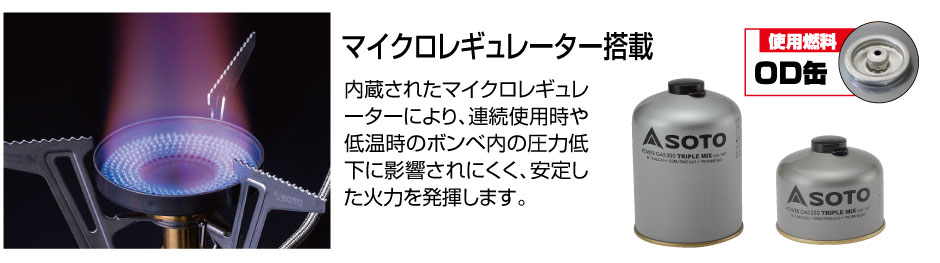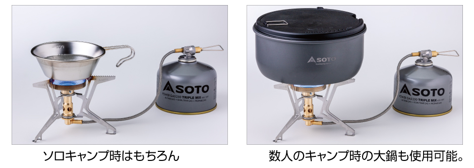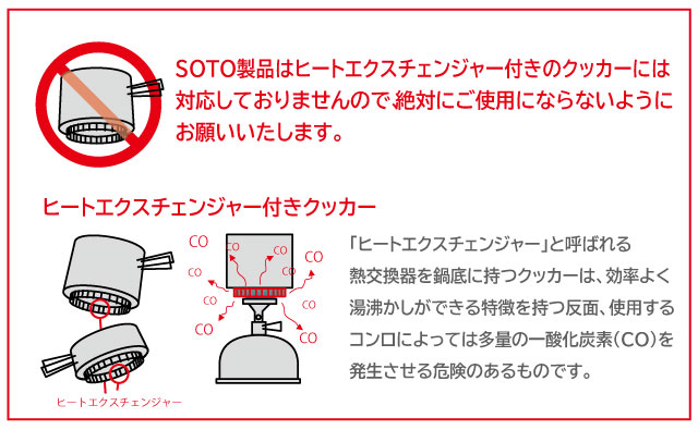 SOTO製品はヒートエクスチェンジャー付きのクッカーには対応しておりませんので、絶対にご使用にならないようにお願いいたします。 ※付属品・パーツを含めました商品の一部に、デザインやカラーが予告なく変更・仕様変更となる場合がございます。 予めご了承くださいませ。