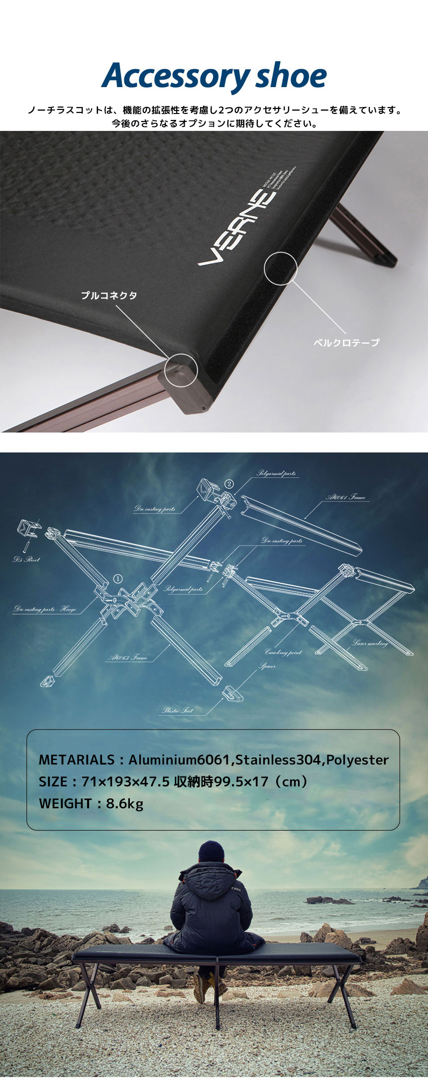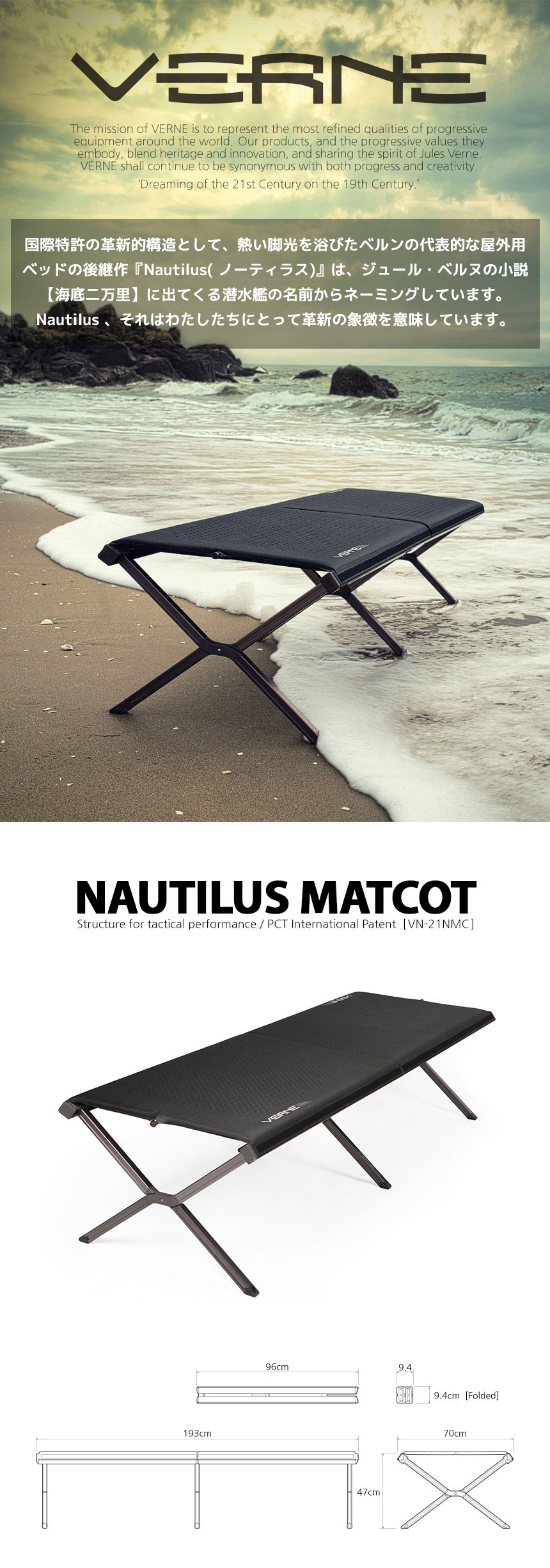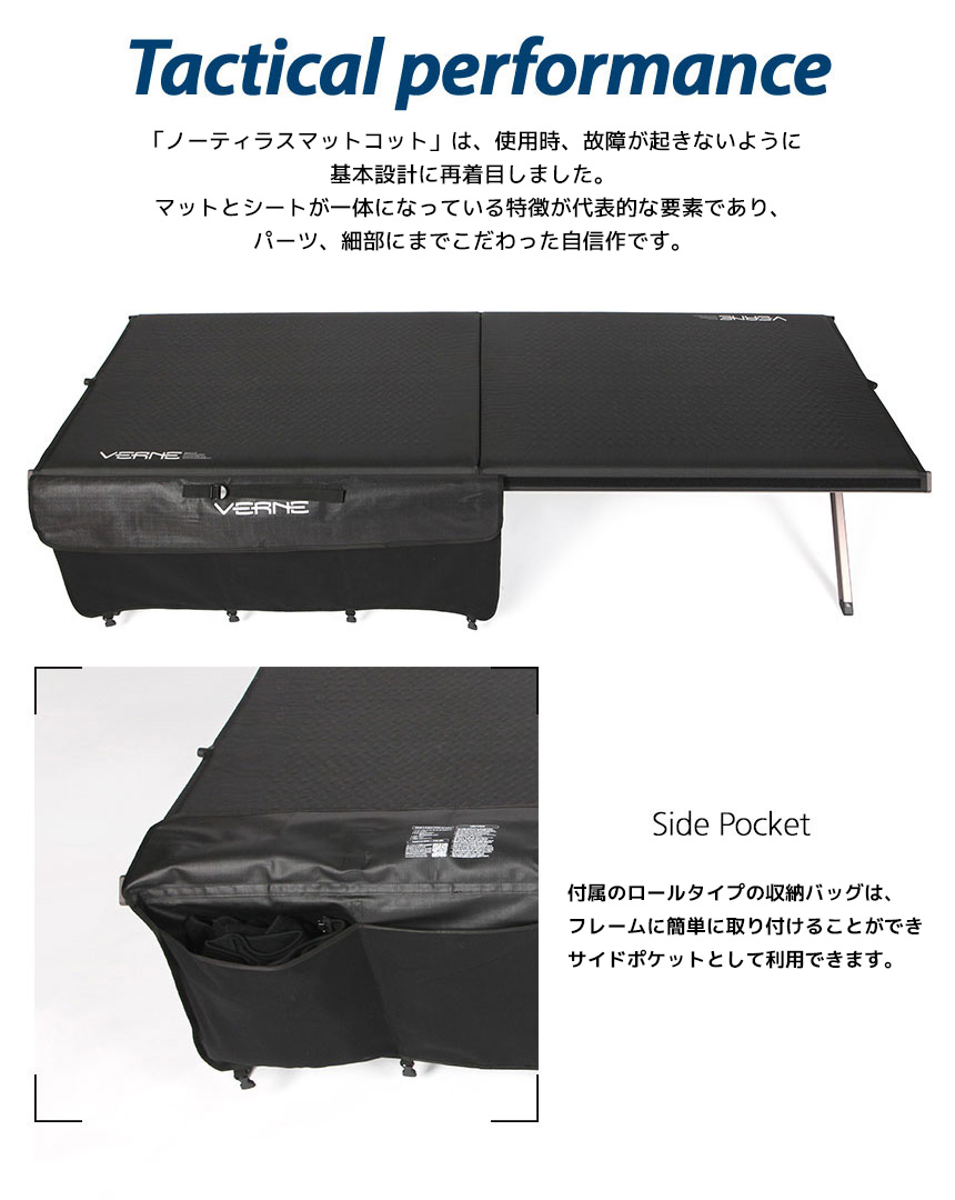 『Nautilus( ノーティラス)』は、ジュール・ベルヌの小説【海底二万里】に出てくる潜水艦の名前からネーミングしています。 Nautilus、それはわたしたちにとって革新の象徴を意味しています。 「ノーティラスマットコット」は、使用時、故障が起きないように基本設計に再着目しました。マットとシートが一体になっている特徴が代表的な要素であり、パーツ、細部にまでこだわった自信作です。 潜水艦をモチーフに、狭い空間、劣悪な環境でも最高の休息を作り出す戦術装備を再現しています。(そう、最高の休息が戦闘力を兼ね備える最も重要な要素です。) 便利な収納を叶えるロールタイプ鞄や、様々なオプションを付属活用できる機能を追加したほか、使用者ご自身でシートを交換できるように考慮しました。 本製品にぜひ寝転がって,空を眺めてみてください。まるで浮かんでいるように感じられるはずです。 METARIALS : Aluminium6061,Stainless304,Polyester SIZE : 71×193×47.5 収納時99.5×17(cm) WEIGHT : 8.6kg