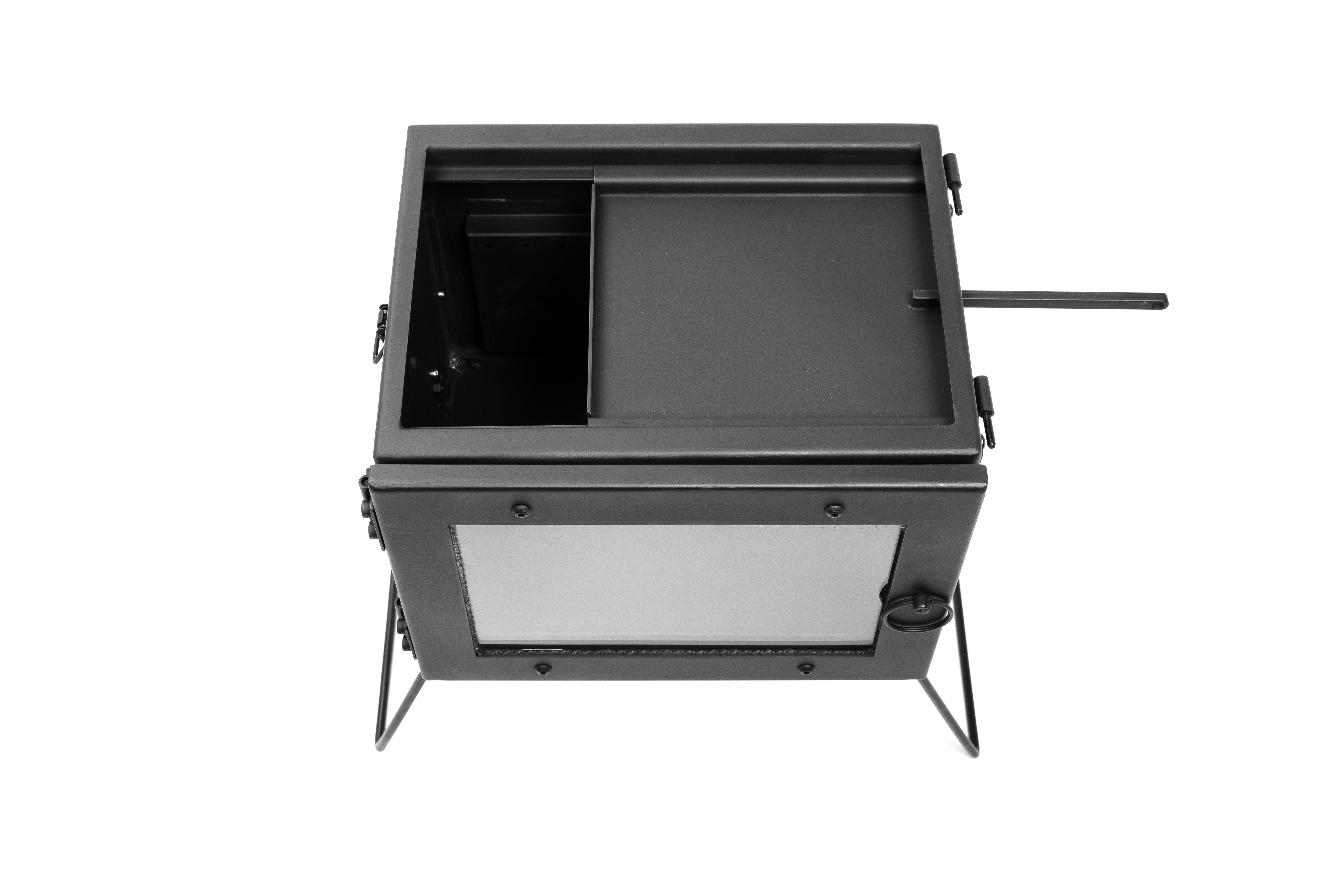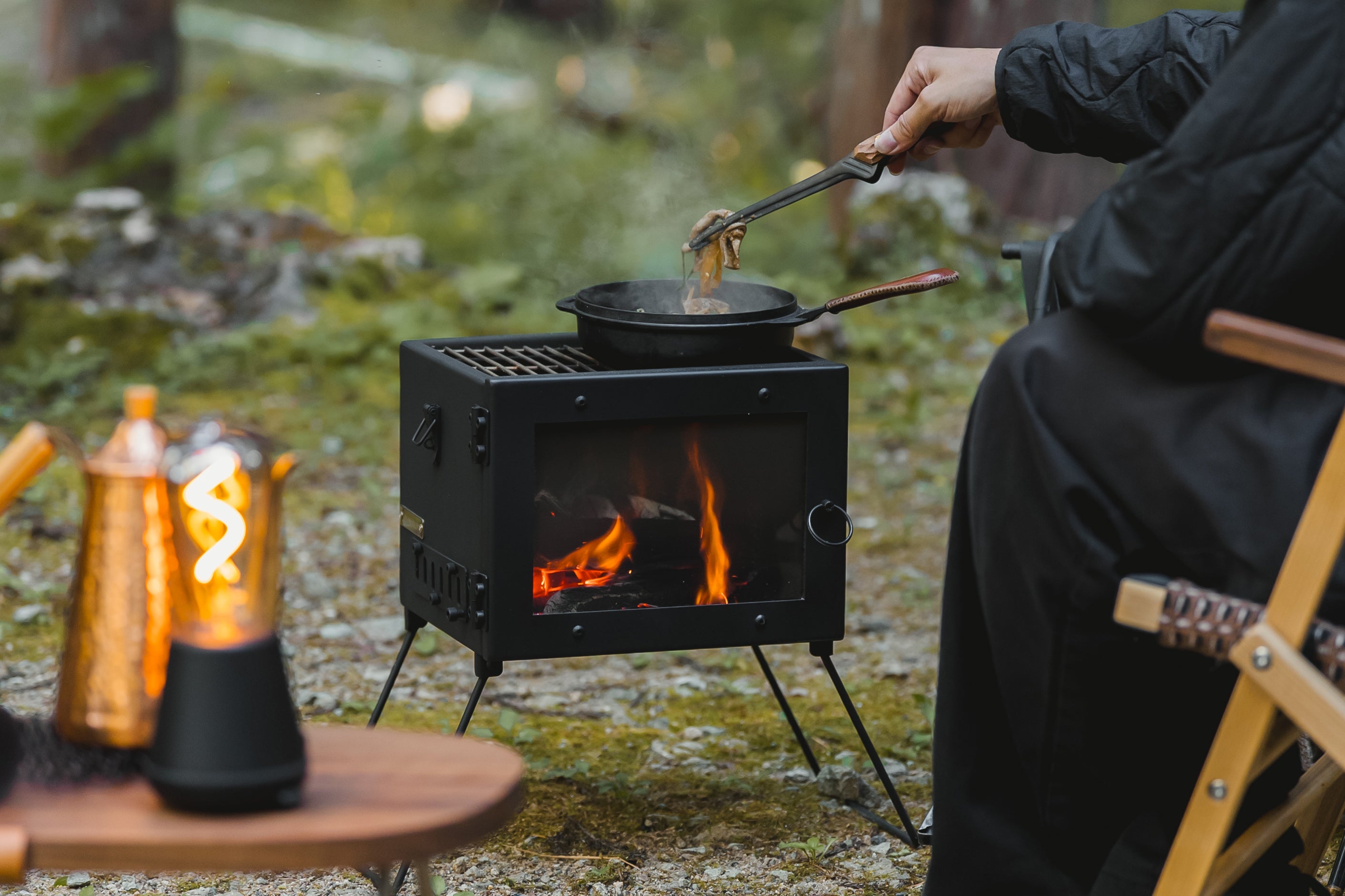 進化した火付け性能 3WAY小型二次燃焼ストーブ セット内容 ・薪ストーブ本体 ・φ58煙突 (250mm × 6本継ぎ トップ・ダンパー付ボトム含む) ・煙突固定用リング (ペグダウンにはロープ・針金などを別途ご用意ください) ・焼き網 ・両口スパナ ・六角棒スパナ ・収納バッグ ※改良の為、予告なく仕様やデザインの変更をする場合がございます。ご了承ください。 POINT.1小型・軽量で扱いやすい二次燃焼薪ストーブ「マイクロ2」 全辺30cm以下・本体重量6.7kgとコンパクトで持ち運びやすく、焚き火台とグリルの機能を兼ね備えた二次燃焼薪ストーブです。 煙突やアクセサリーもすべて炉内に収納できるため、荷物をすっきりまとめられ、持ち運びや保管も簡単。 シンプルな構造ながら二次燃焼機構を搭載しており、高い燃焼力で煙もクリーン、灰も少なく後片付けもラクラク。 オールシーズン活躍し、初めて薪ストーブを使う方にも安心しておすすめできる1台です。 POINT.2薪ストーブ・焚き火台・グリルとして使える3WAY仕様 薪ストーブとして天板での調理はもちろん、天板を外すと二次燃焼構造の焚き火台としても使用でき、付属の焼き網を使えばグリル調理も楽しめる3WAYタイプ (※燃料に炭は使用できません) 。 上から眺める焚き火とはまた違った火の見え方を楽しむことができます。 また、火の状態がわかりやすく、吸気口や扉を開けて火の調節ができるため、グリルとしても使いやすい構造です。 ※焚き火台やグリルとして使用する際は、天板蝶番 (金具) を横にスライドさせ、天板を完全に取り外してご使用ください。 POINT.3可動式バッフルとダンパー煙突を標準搭載 火力をコントロールしやすい可動式バッフルと、空気の流れを調整できるダンパー付き煙突を標準装備。 これにより着火がスムーズになり、炎の強弱や燃焼時間を自在に調整可能です。 初心者でも扱いやすく、上級者にはさらに快適な火加減コントロールを提供します。 POINT.4大きなガラス窓が魅せる、迫力の炎 従来の小型薪ストーブでは味わえなかった迫力の炎を、大きなガラス窓から存分に楽しめます。 コンパクトな本体サイズながら、燃焼室全体の炎を広々と眺められる設計で、焚き火のような臨場感を演出。 調理中に火加減を確認しやすいのはもちろん、ゆらめく炎を鑑賞しながら過ごす時間はキャンプの贅沢なひとときに。 「暖を取る」「調理する」だけでなく、「炎を楽しむ」楽しみをプラスした、焚き火好きにこそおすすめの一台です。