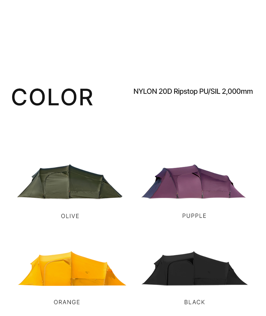 Nylon 20D Ripstop PU/SIL 2,000mm, Nylon 40D BR-WR, Duralumin - Orange, Purple, Black