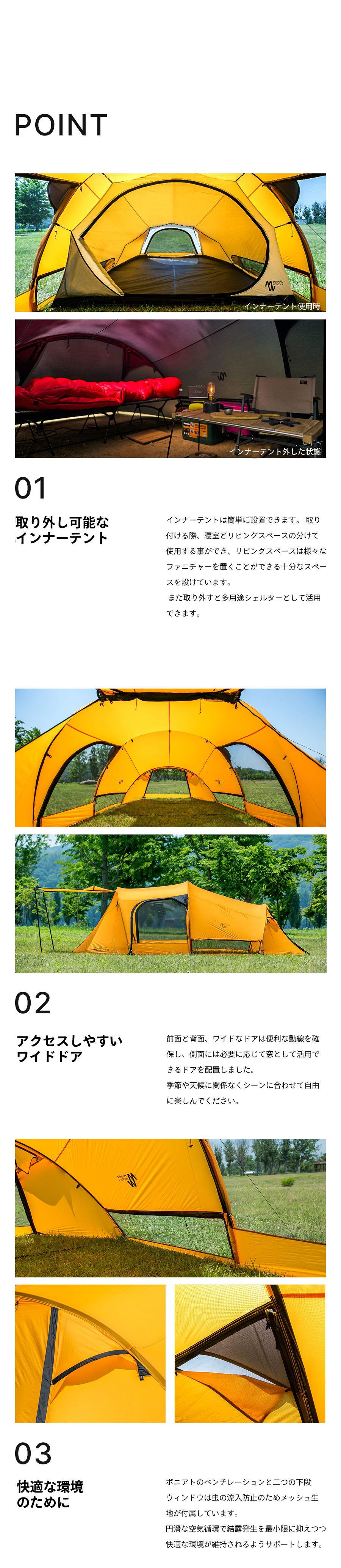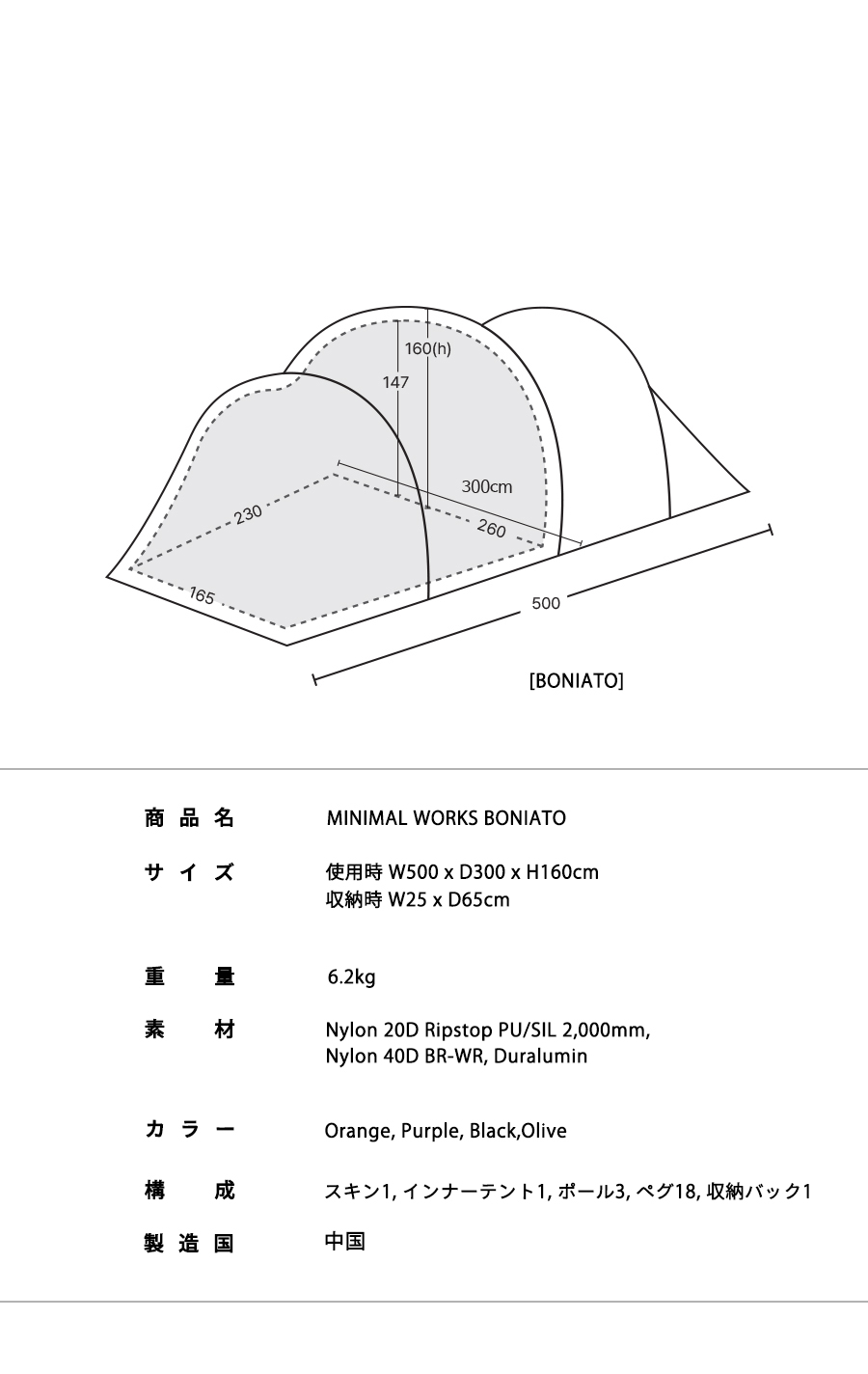 ミニマルワークスのボニアトはコンパクトなサイズと効率的なスペースを提供するトンネル型テントです。