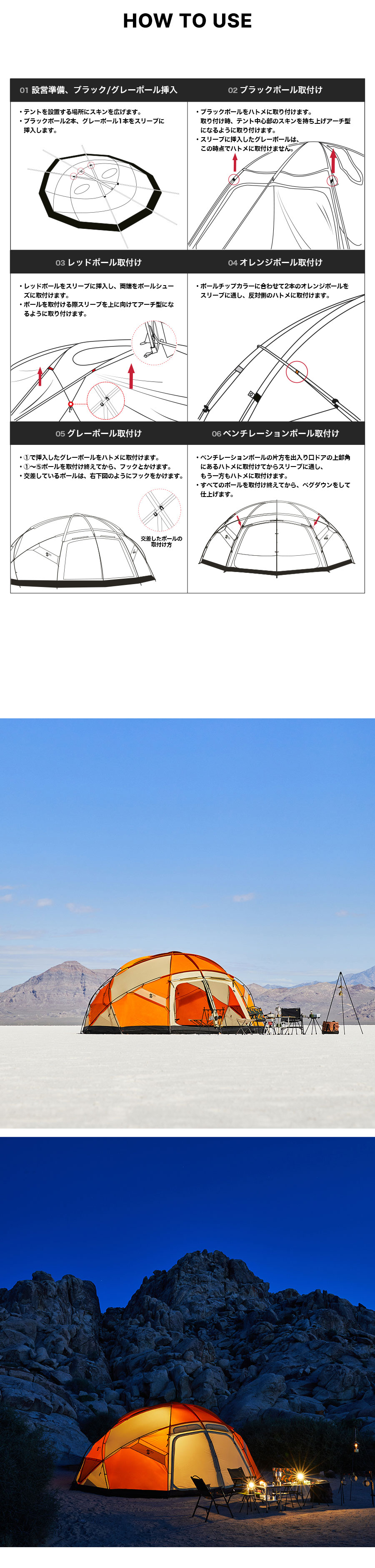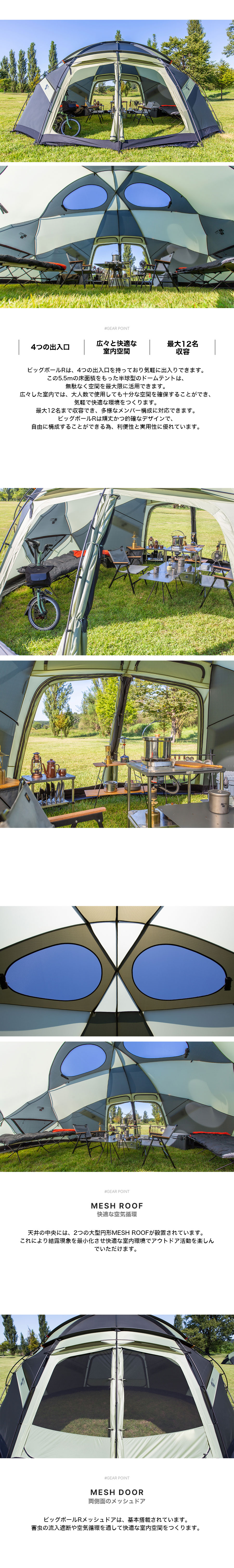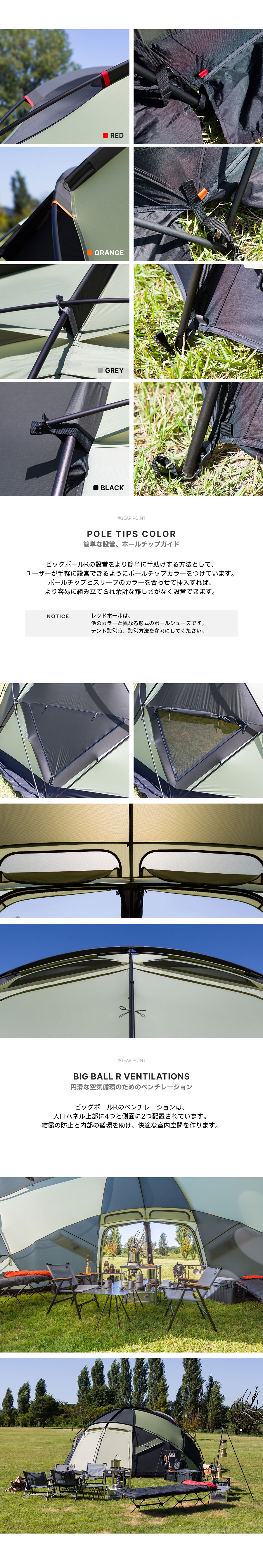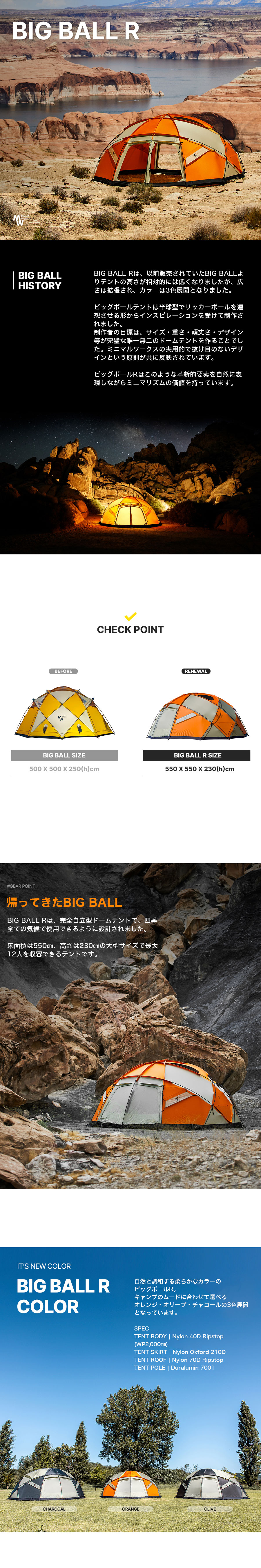 UNBY株式会社(unby.live)はMINIMAL WORKSの日本総代理店です。 BIG BALL Rは、以前販売されていたBIG BALLよりテントの高さが相対的には低くなりましたが、広さは拡張され、カラーは3色展開となりました。 ビッグボールテントは半球型でサッカーボールを連想させる形からインスピレーションを受けて制作されました。 制作者の目標は、サイズ・重さ・頑丈さ・デザイン等が完璧な唯一無二のドームテントを作ることでした。ミニマルワークスの実用的で抜け目のないデザインという原則が共に反映されています。 ビッグボールRはこのような革新的要素を自然に表現しながらミニマリズムの価値を持っています。 ビッグボールRは、完全自立型ドームテントで、四季全ての気候で使用できるように設計されました。 床面積は550?、高さは230?の大型サイズで最大12人を収容できるテントです。
