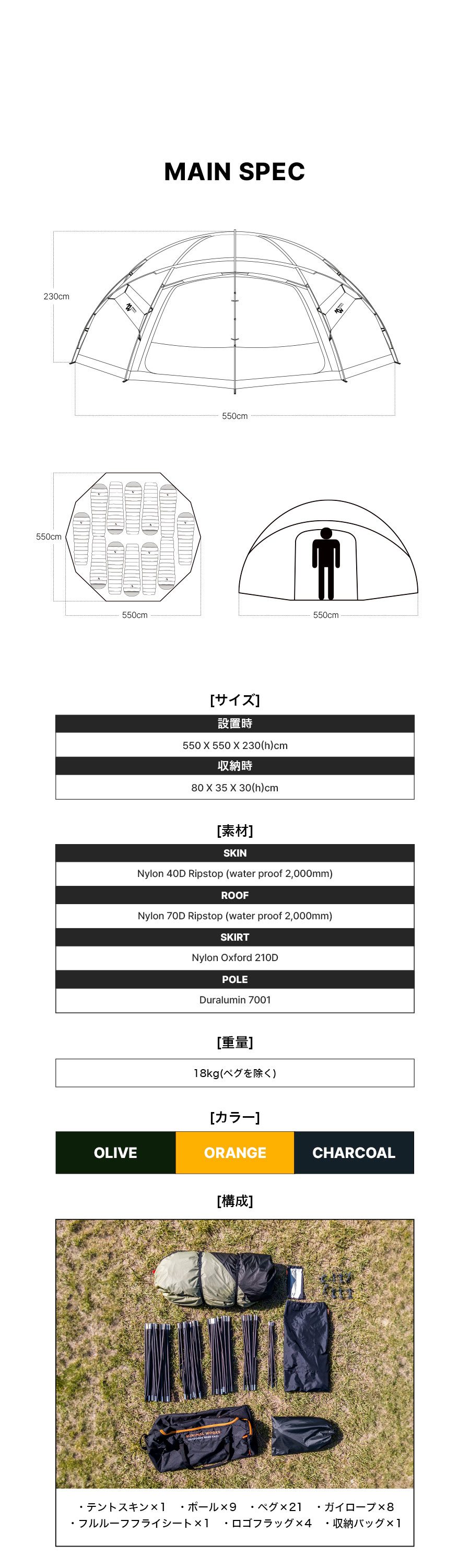 使用時:W550 x D550 x H230cm 収納時:W80 x D35 x H30cm 重さ:18kg
