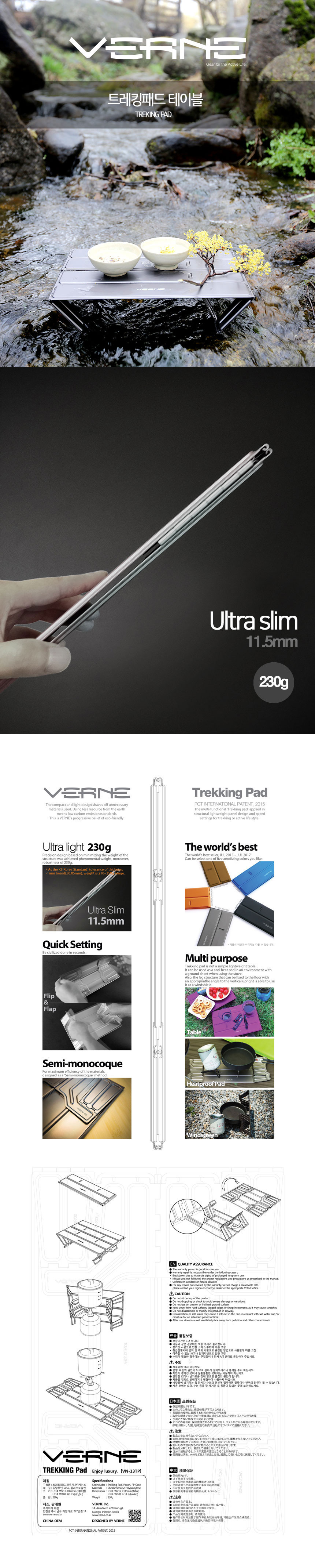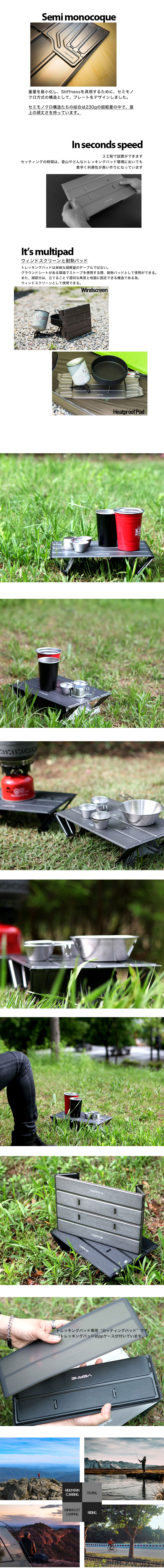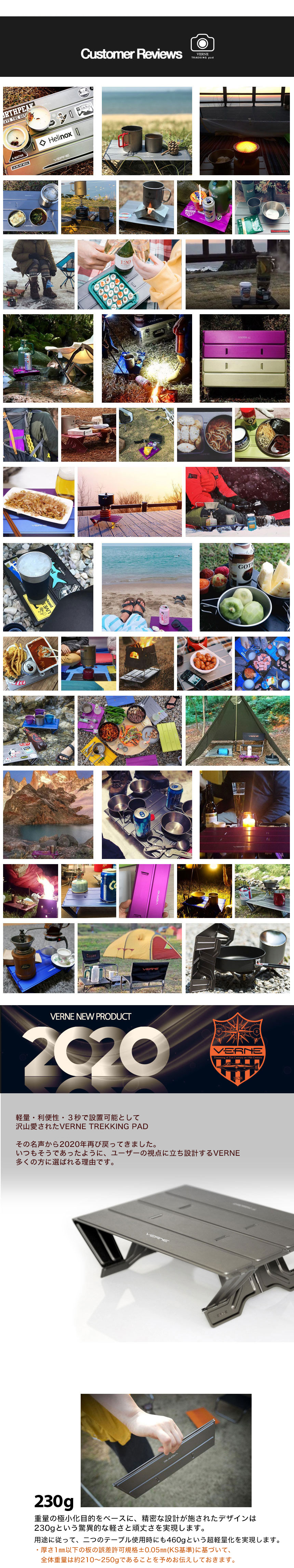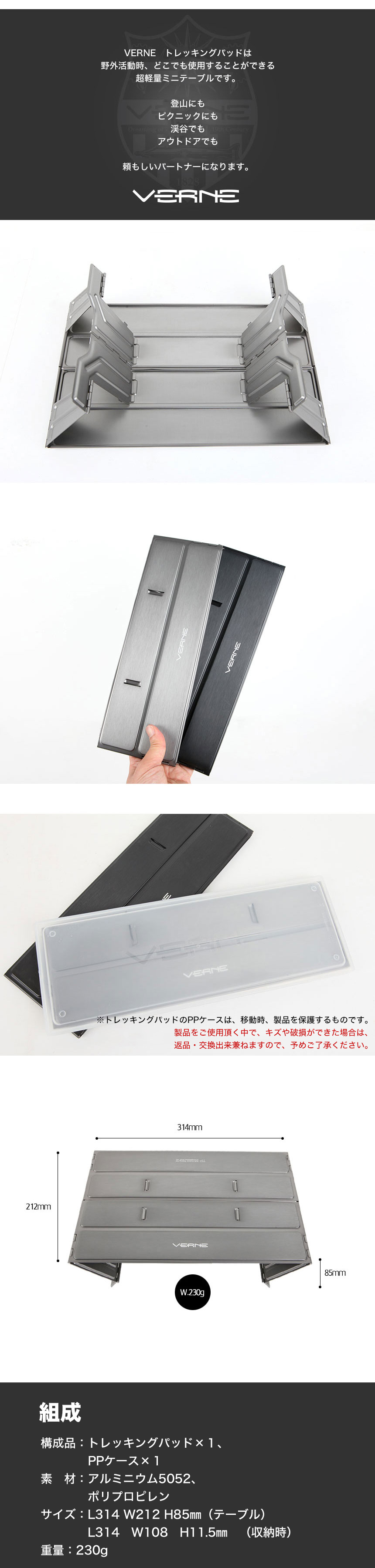 素材の特性上、生産過程で多少のキズ・スレが発生する場合がございます。これによる返品・交換は対象外となりますので、予めご了承の上、ご注文頂ますようお願い申し上げます。 230gという驚異的な軽さと堅牢性を実現したテーブル。 3回の折りたたみのシンプルな構造で、秒単位で設置が可能です。 また、風防や耐熱パッドとしてもご利用いただけます。 スムーズな組み立て・解体を実現するため、接続部分のシルバーピンは絶妙なサイズにしております。そのため、完全に固定しておらず抜け落ちる場合もございますので、ご使用の際にはお気を付けください。 VERNE ディレクターインタビューはこちら