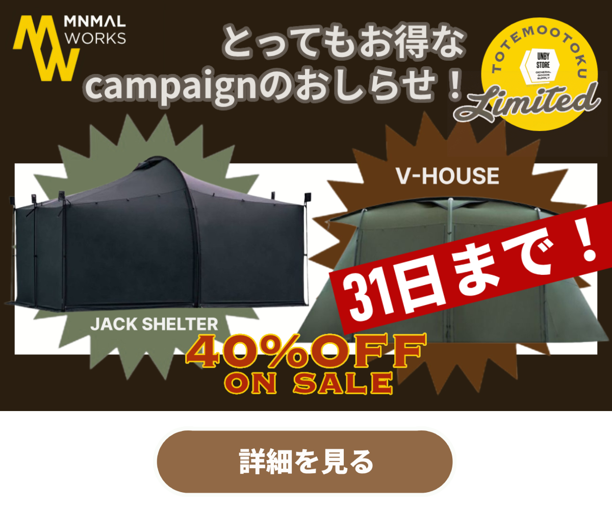 MINIMALWORKSの人気アイテム「JACK SHELTER」「V HOUSE」を40%OFFキャンペーンも31日までとなります!!