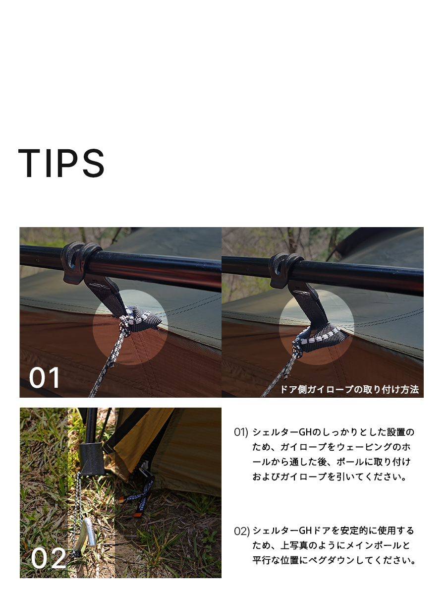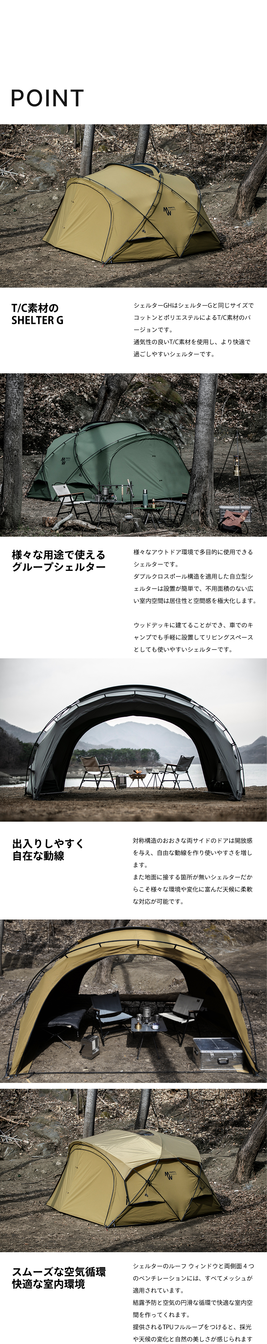メイン素材にT/C素材を採用し結露を最小限に、構造は利便性の高いSHELTER Gの特性を生かしています。またオプションであるメッシュドアとTPUドアは、簡単に脱着できる為、 使用者の用途と環境に合わせて自由な応用が効きます。