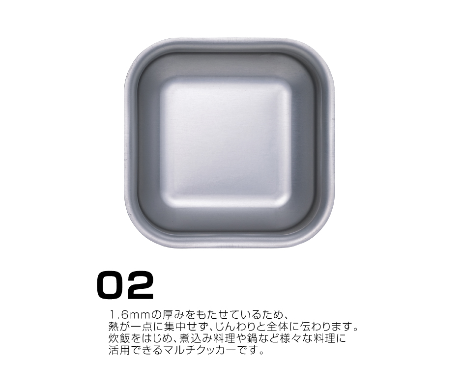 あれこれ持たなくていい。 インスタントラーメンも炊飯もこれ一つで。袋入りのインスタントラーメンがピッタリおさまる正方形の角形クッカーです。 板厚1.6mm。一般的な製品の約2倍の厚みをもたせ、より頑丈な設計にしているため、凹みへの耐性が大幅に高められています。熱伝導がよく、炊飯にも適していて、美味しいごはんが炊きあがります。 ひとつで何役もこなしてくれるマルチクッカーを、キャンプギアのラインナップに加えてみませんか?
