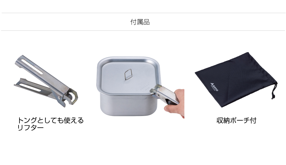 ●外形寸法(収納時) 幅147×奥行147×高さ80mm ●重量 総重量:約375g 鍋本体+フタ:約306g リフター:54g 収納袋:15g ●内容量 1.0L