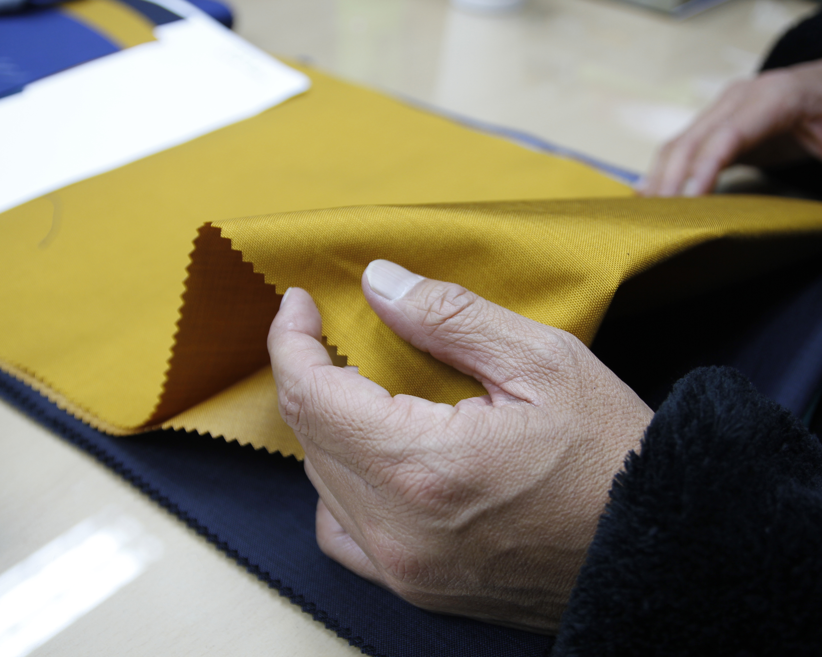 辿り着いたのは、タテ糸に1000D、ヨコ糸に840Dの66ナイロン糸を使用したオリジナルのCORDURA Ballistic® 。タテ糸に空気を含ませるATY加工を施し、重厚ながらもどこか温かみのあるスパンライク調の質感を実現しています。