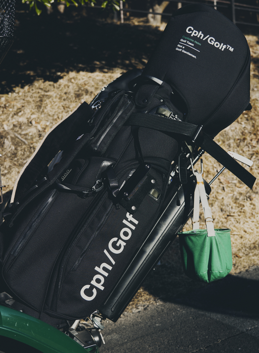 Cph/Golf™️のロゴとブランドカラーのオリーブカラーをキャディバッグのテープ部分にPOINTになるように配置。また、プリントしているロゴもそれに合わせてグリーンカラーのプリントも入れています。