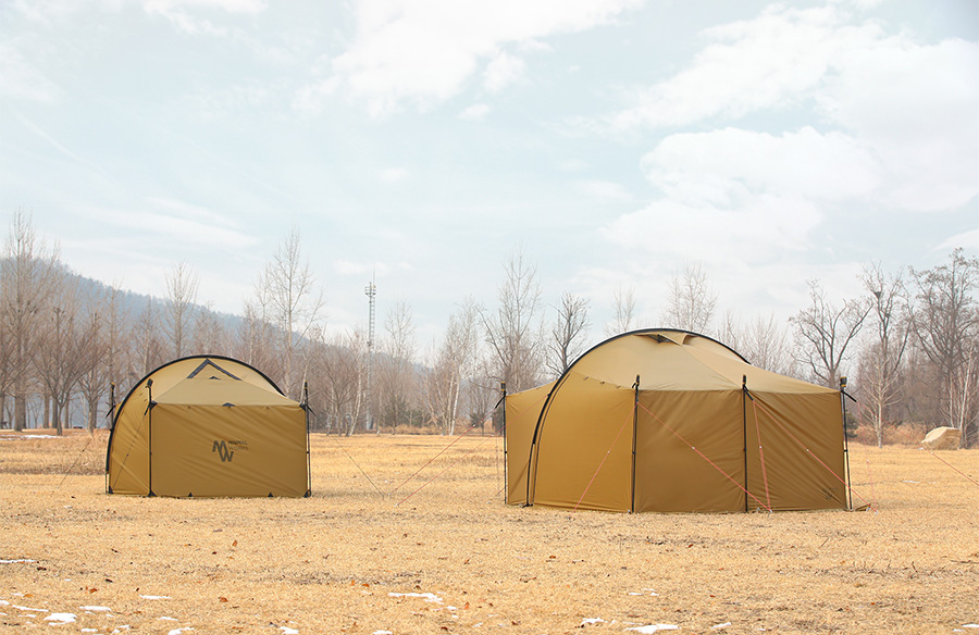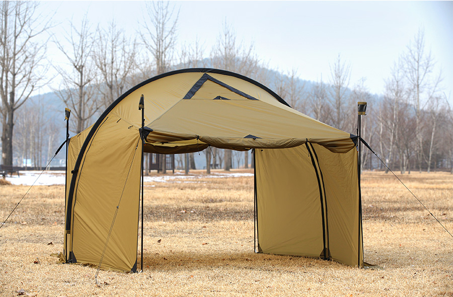 全ての壁面が解放できるので、夏季から冬季までオールシーズンで使用できます。サイドウォールがほぼ直立しているので通常の湾曲した作りのシェルターよりも圧迫感がない上、実際に広く使えます。