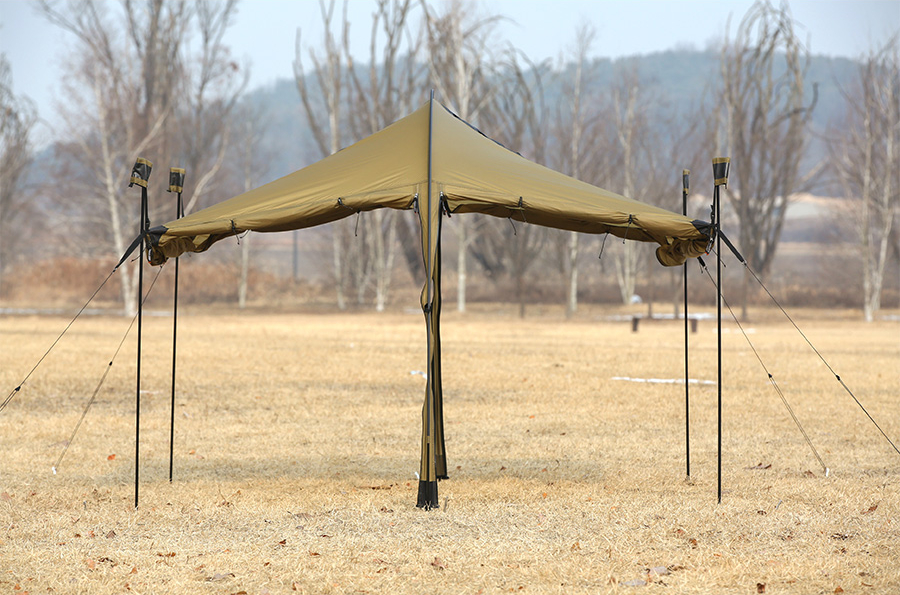 2つのポール(2本連結式)で構成され、簡単&素早く組み立てが可能。自立型シェルターなので、風の弱いところではペグダウンがいらなく、周りの状況によって柔軟に対応できます。