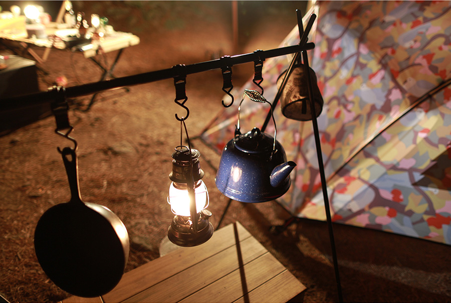 テントとタープに使われていたアルミニウムポールで作られたインディアンハンガーは小さくて軽いので収納しやすく、組み立て&解体がとてもミニマル。