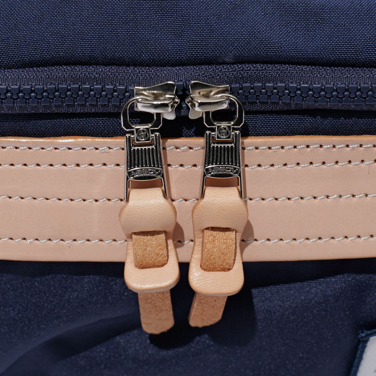 このアイテムのもう一つの魅力は、経年変化を楽しめるベジタブルタンニンレザーを使用している点です。付属レザーには、革本来の風合いを生かしたヌメレザーを採用し、使用するほどに味わい深い色合いと質感に変化していくのが特徴です。環境にも配慮したこのレザーは、エコフレンドリーな素材として注目されています。フロント部分には、ワッペン風に仕上げた織りネームを使用し、AS2OVオリジナルの引き手をあしらったファスナーがデザインのアクセントとなっています。