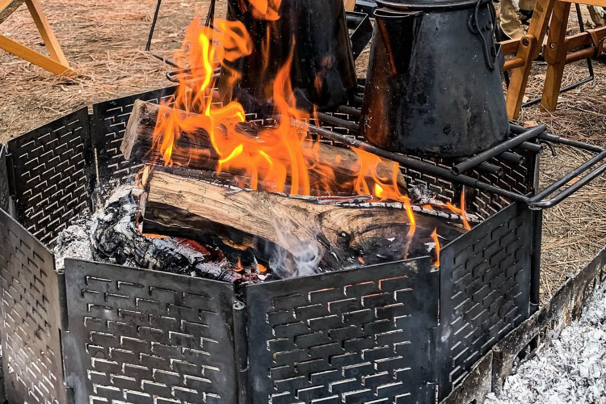 素材は丈夫な鉄を使用し、高温高圧で窒素分子を染み込ませて表面を硬化させる「窒化加工」が施されています。そのため、ガンガン薪を燃やしても非常に変形しにくくなっている上、サビにも強いタフな焚き火台に仕上がっています。風防部分には、積み重ねたレンガをモチーフにしたレーザーカットが施されています。