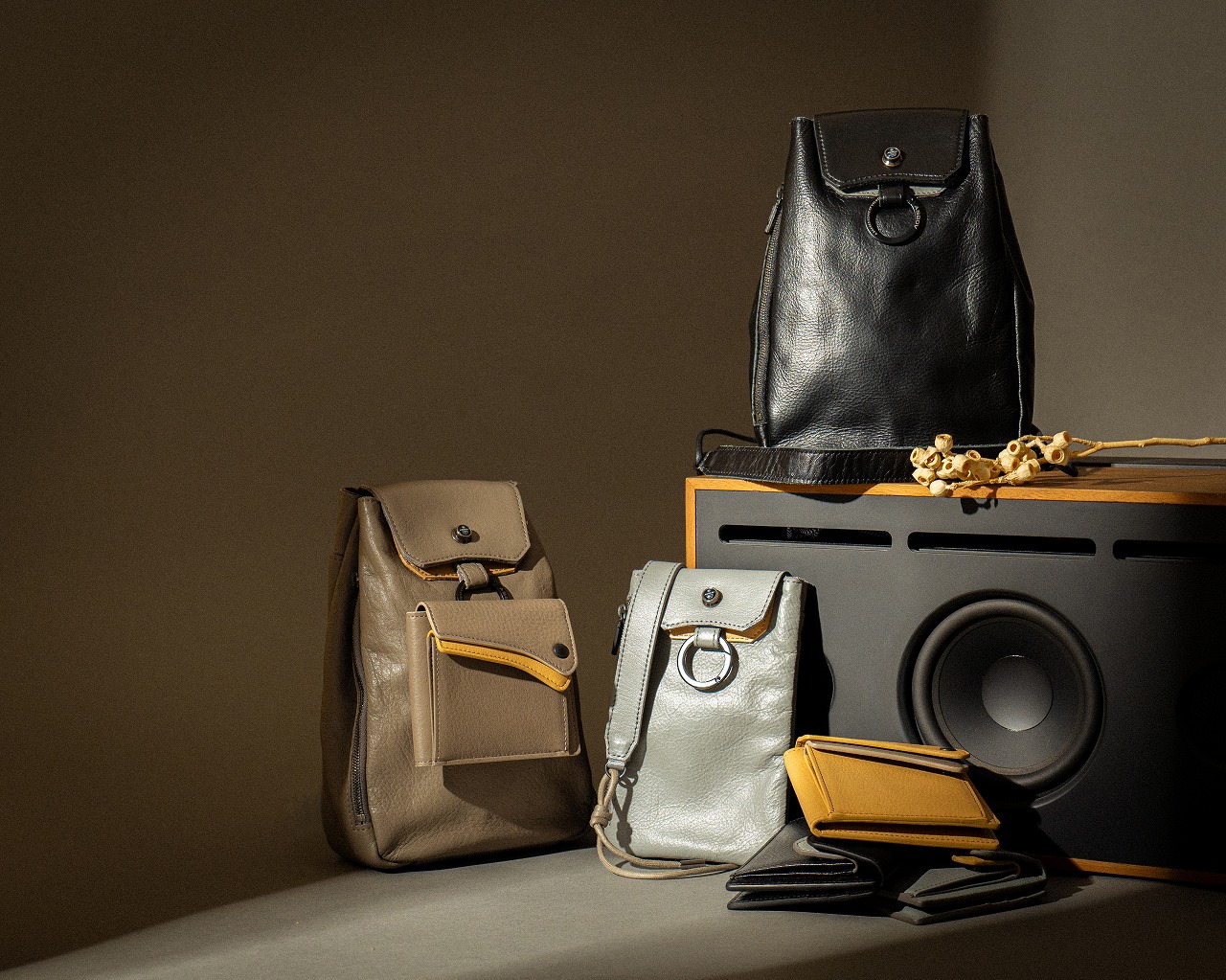 巾着型の「DRAWSTRING SHOULDER」、ミニマルな「MINI SHOULDER」、機能的な「COMPACT WALLET」の3種類。