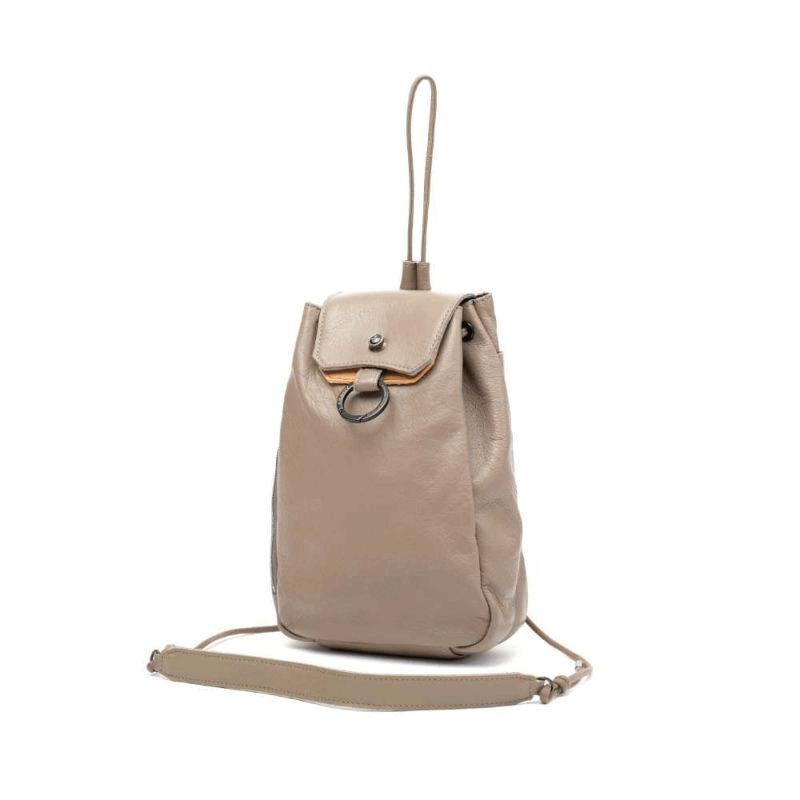巾着・ミニショルダーは、ドイツホックを使用したワンタッチ開閉式フラップデザイン。(つまみを前に引くと開きます)使えば使うほどドイツホックが自分の指に馴染んでくる感覚も歴史あるパーツの醍醐味です。