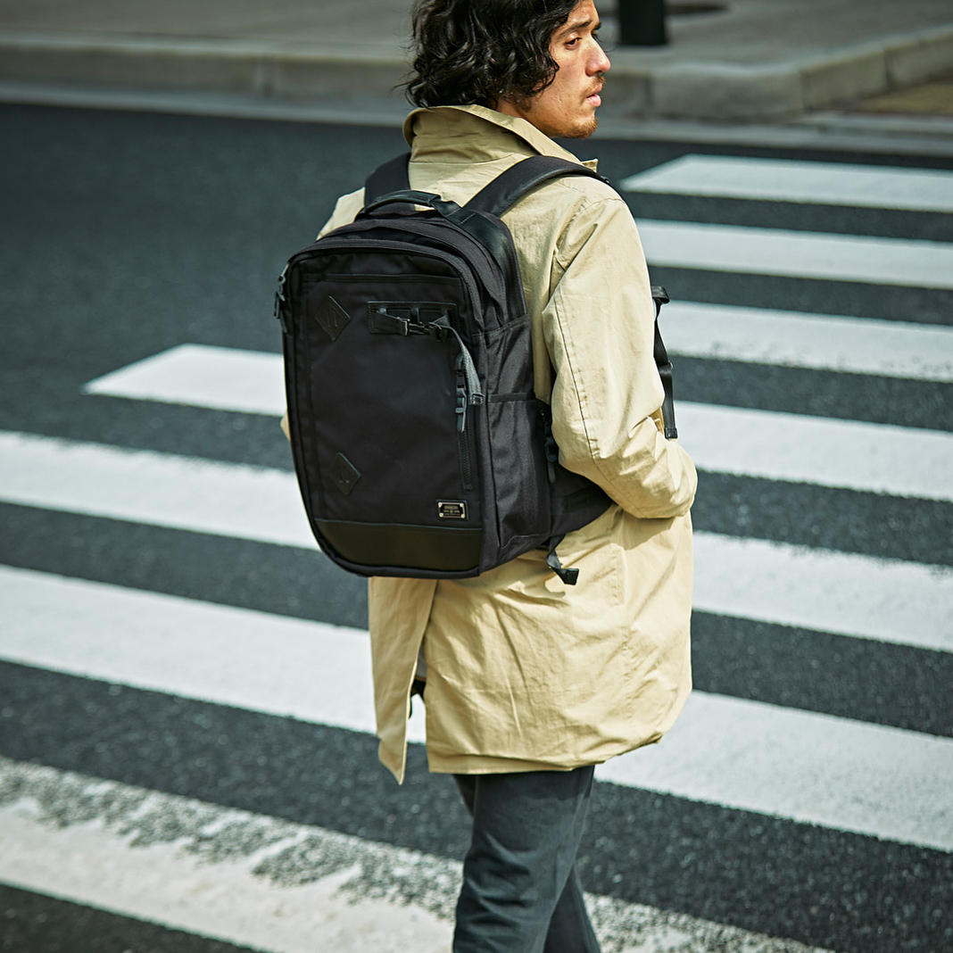 ビジネスシーンでもタウンユースでも使っていただけるデイパック。特徴的なのは前面にPCポケット、ペンケースなど細かな収納ポケットを配置したこと。