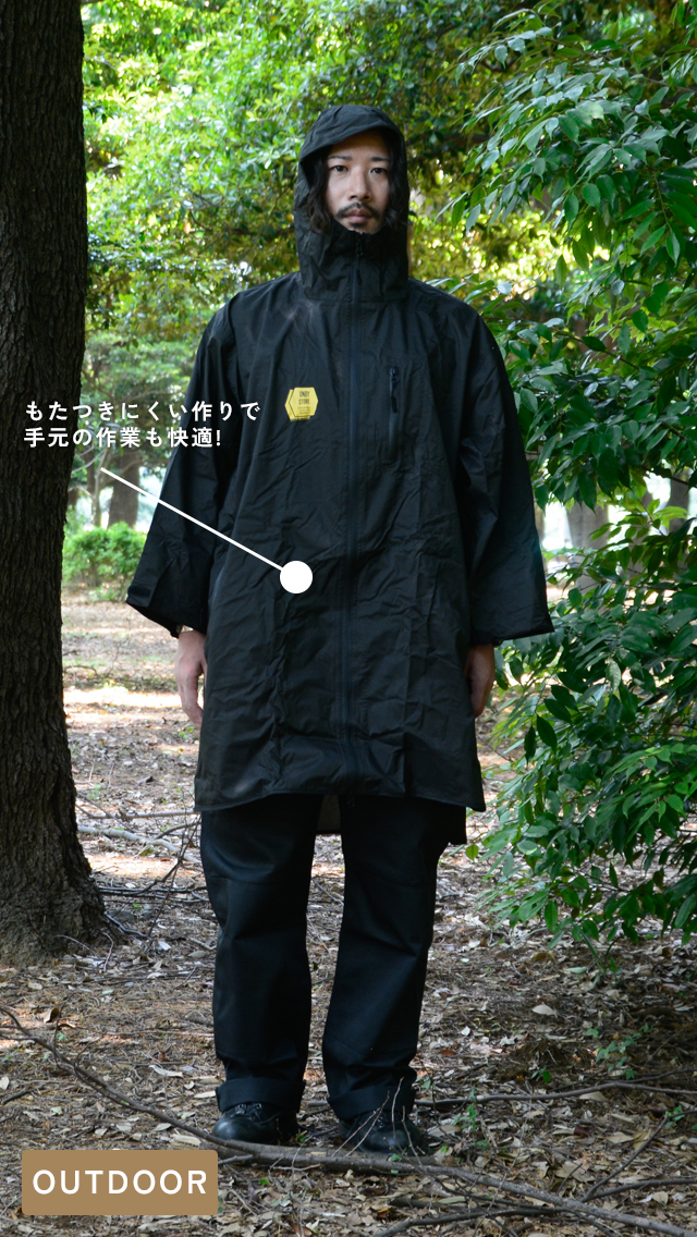 荷物を背負ったまま羽織れるフルジップ仕様と止水ポケット、手元の作業時に役立つ袖めくり用ベルトが付いているのもポイントで、アウトドアのポンチョはこれで決まり。