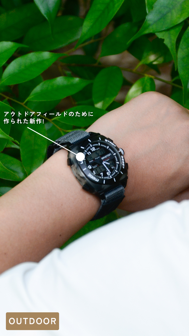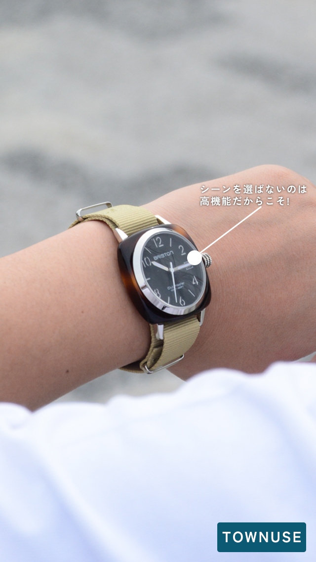 BRISTONらしいクラシカルな雰囲気を纏うマツケリ社別注アセテートのフレームや国産ムーブメントの安心感を残しながら、防塵機能、100m-10m気圧防水とグリップ力と耐久性に優れたオリジナルのナイロンベルトストラップなどアウトドアシーンにぴったりなタフなデザインに。