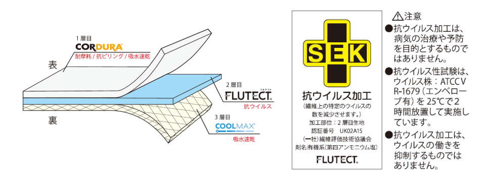 速乾性に優れ、耐摩耗により耐久性を高め、抗ピリング性により長い使用を考えた構造となっています。
