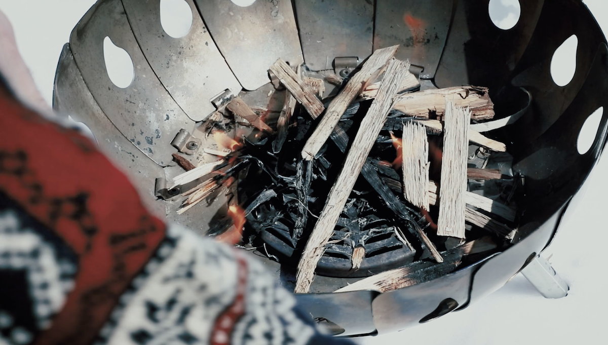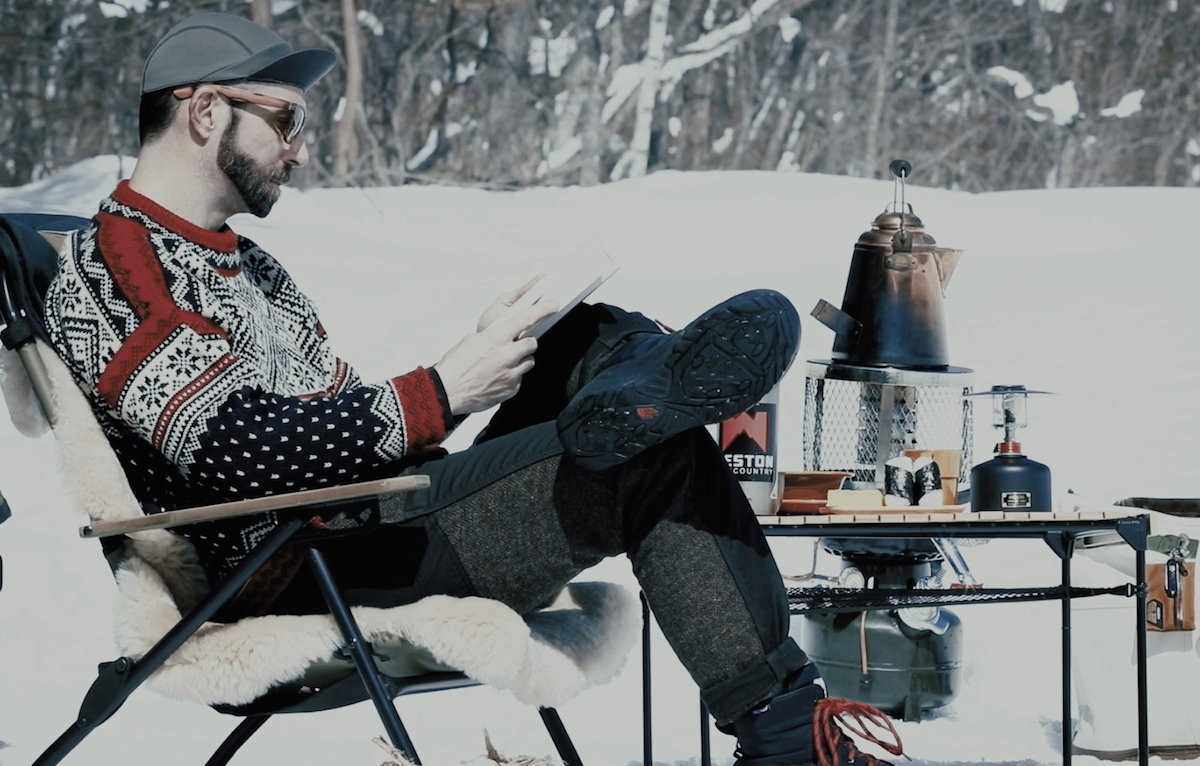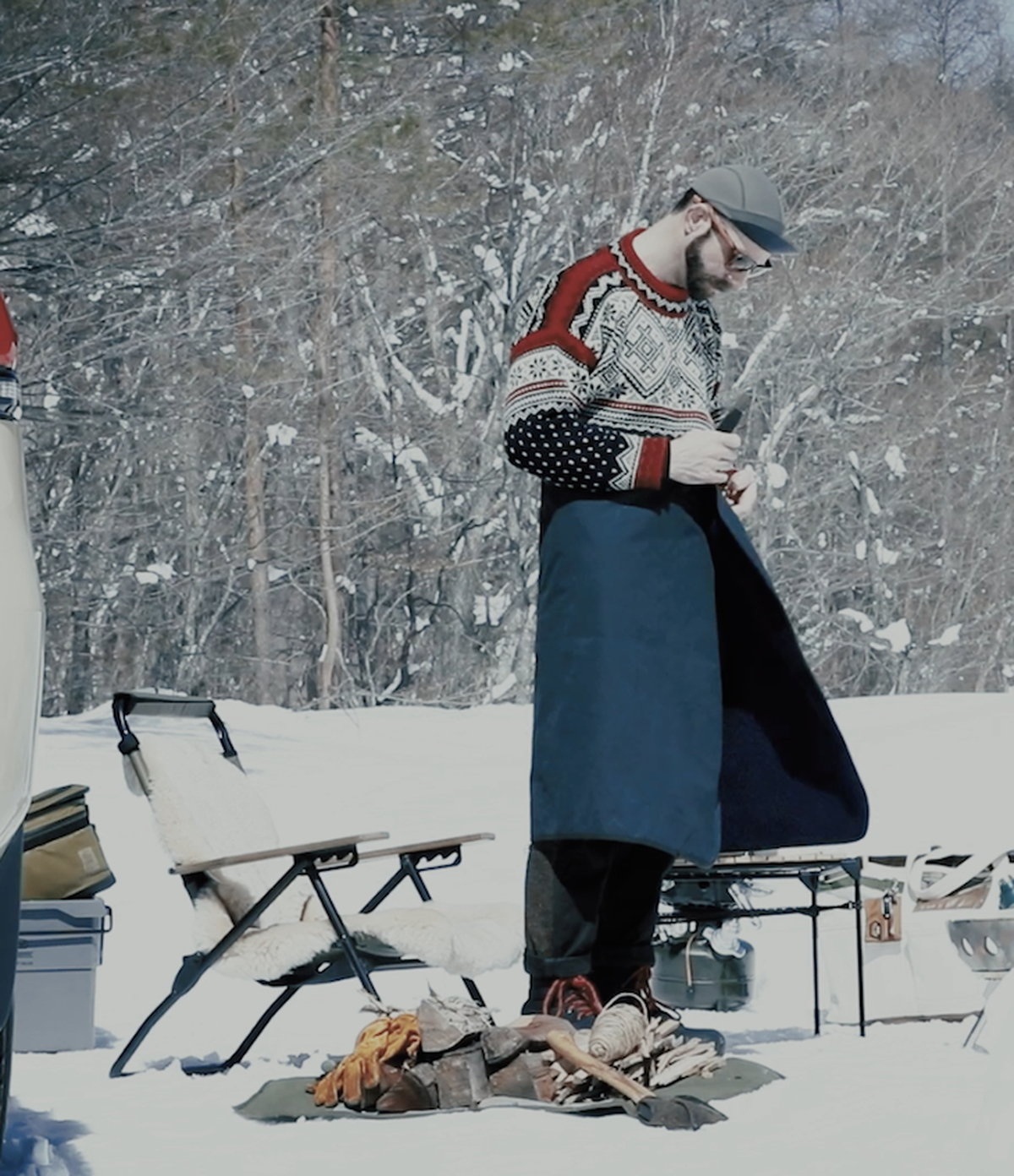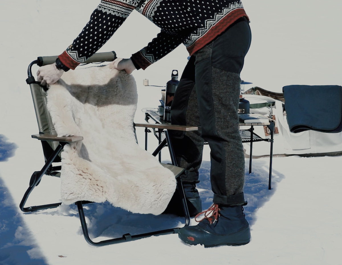 AS2OVのリクライニングチェアにムートンをひいて、焚き火台に火を入れます。