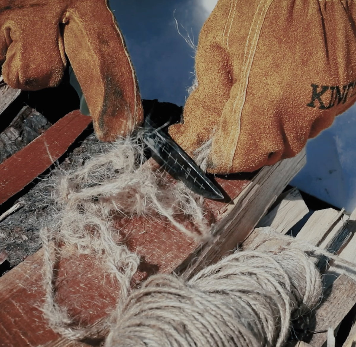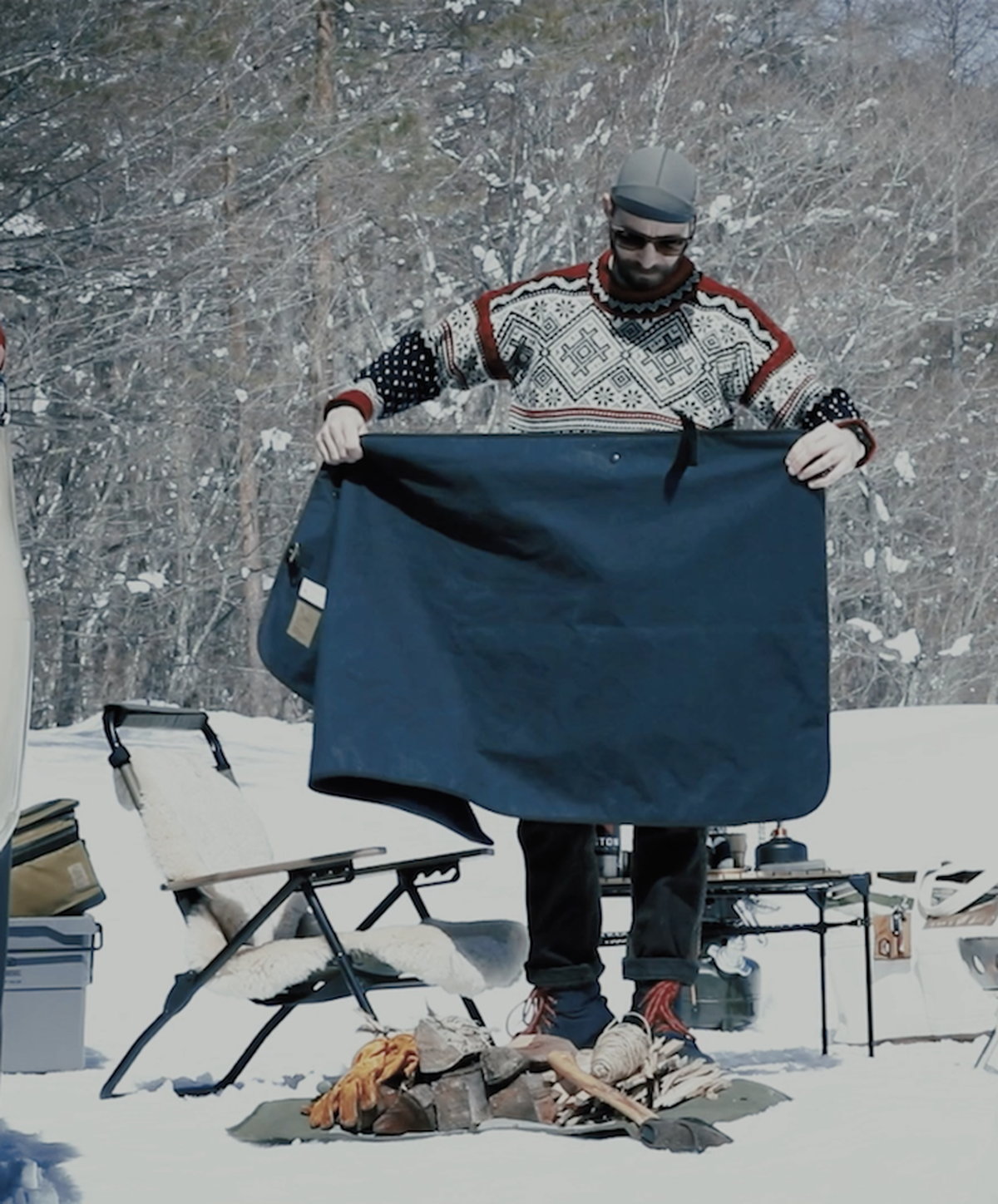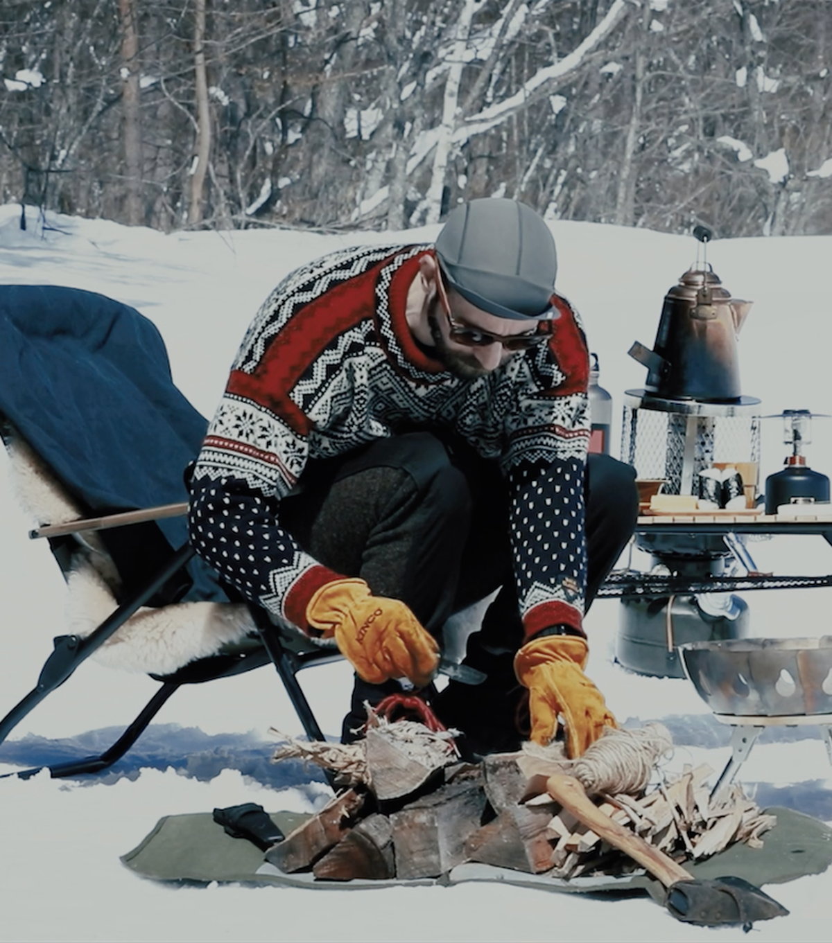 AS2OVのリクライニングチェアにムートンをひいて、焚き火台に火を入れます。