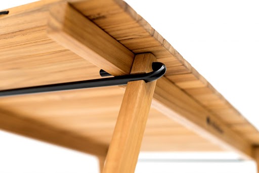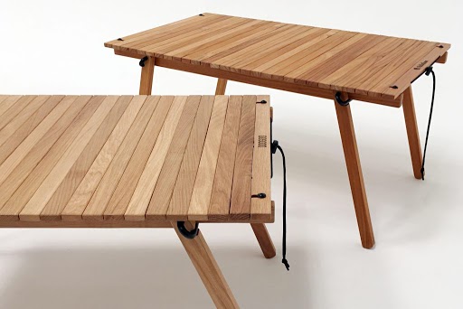 両端をU型に曲げた金物に木パーツを挿しこむ独自の脚構造とロール式天板のTHE TABLE 420のうつくしさ。