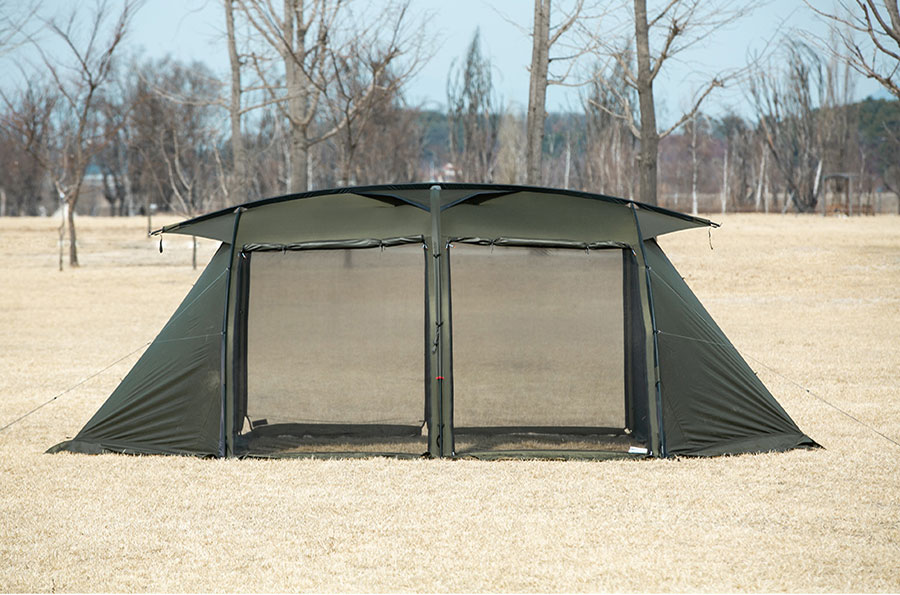 なので、V HOUSE Mを例にすると、スキンとメッシュスキンの二重構造になっていて、シェルターのほか、メッシュスクリーン、タープなどで活用できるようにし側面のベスティブルは拡張型(三角形)、基本型(平面)の2つのスキンを用意し、さまざまな環境でもユーザーが選んで使用出来るスタイルにしました。