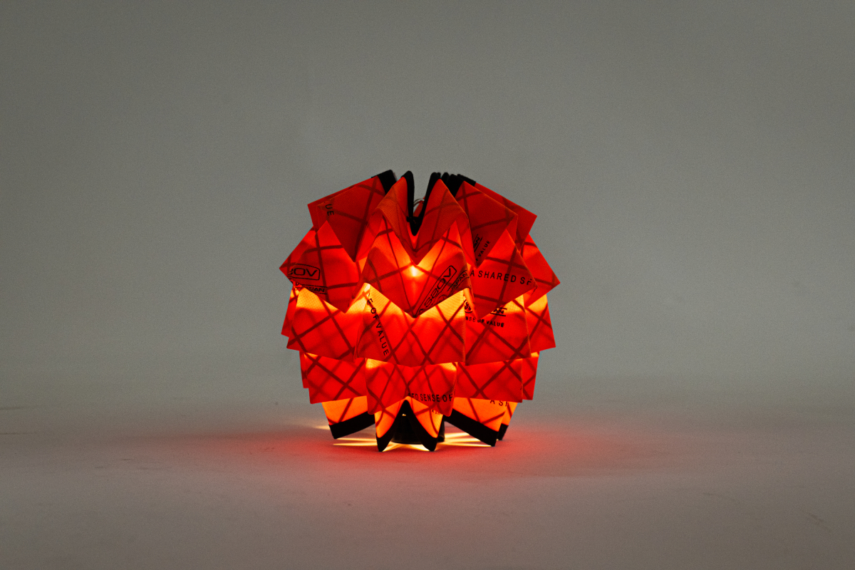インテリア業界出身のSOLさんが、キャンプ好きが高じて、LEDランタン用のランプシェードとして、一点一点ハンドメイドで織り上げたプロダクト。